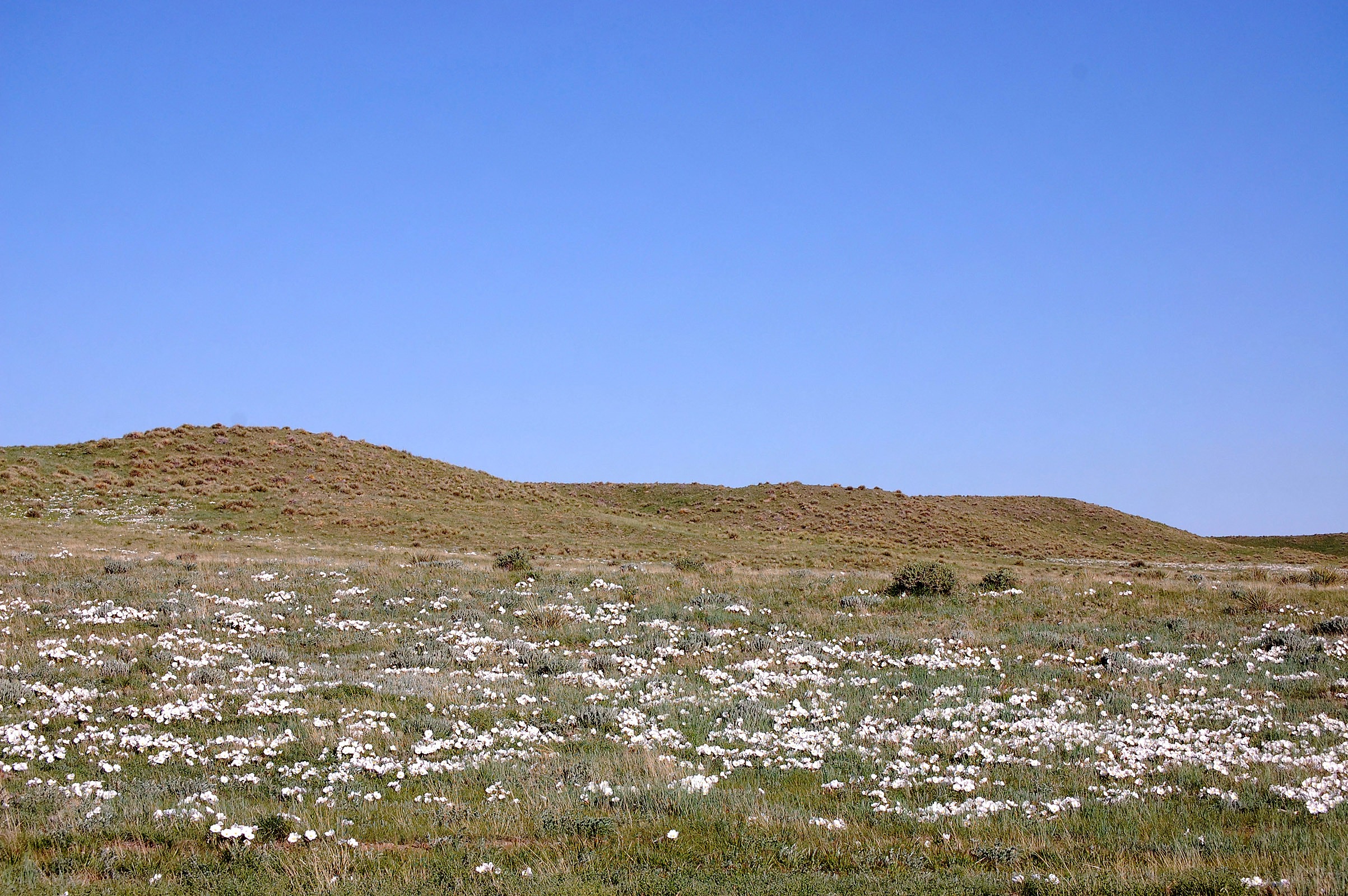White flowers on SGS with hills in background.