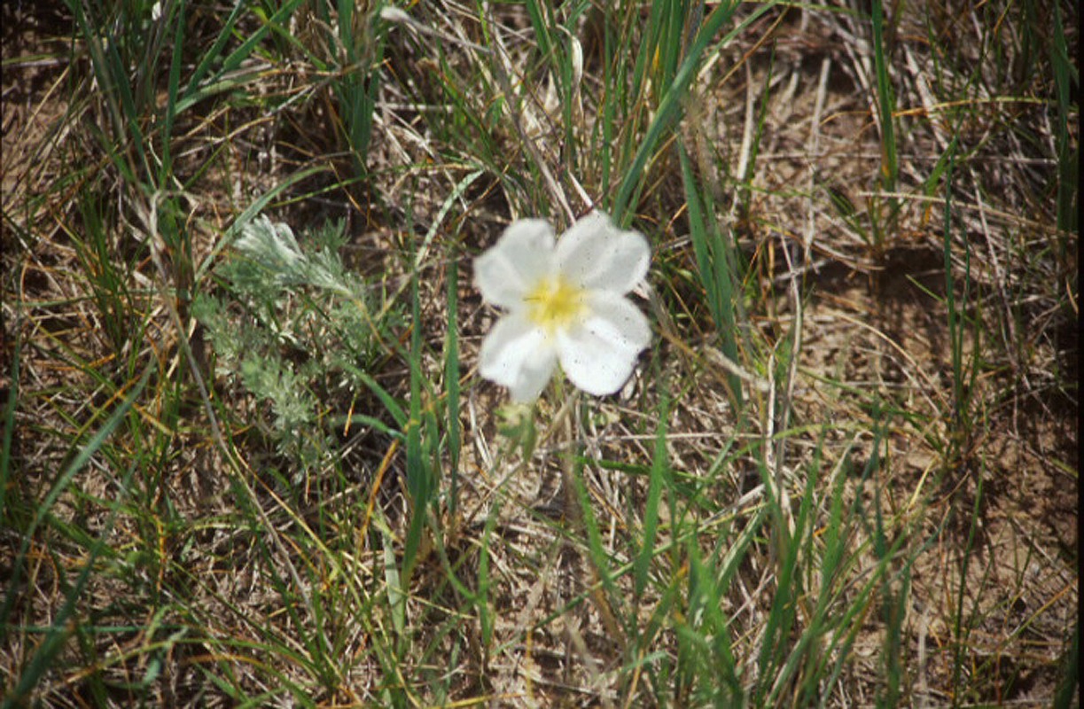 Single white flower of evening primrose on SGS, showing nearby leaves of other natives.