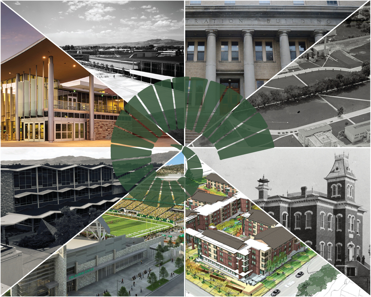 CSU building collage of Old Main (black and white), the Oval (black and white), the Administration Building (color), 1960s Lory Student Center (black and white), 2016 Lory Student Center (color), 1960s Morgan Library (black and white), Artist's rendering of new stadium (color), Artist's rendering of Aggie Village Redevelopment.