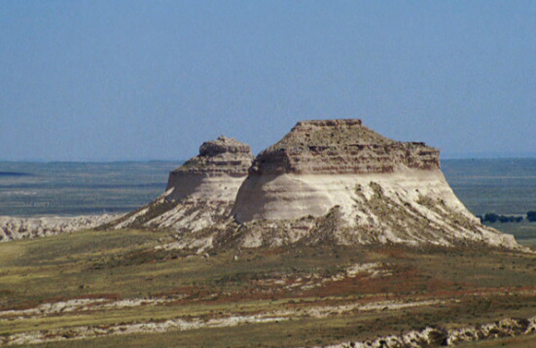 Both Pawnee Buttes surrounded by grasslands.