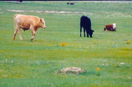 Three calves resting, grazing and frolicking on SGS with prairie dog burrow in foreground (132k file).