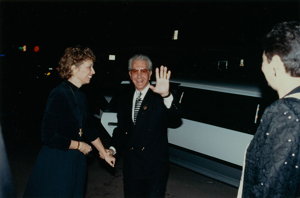 Photograph of Linda Carlson and Mr. Blackwell arriving at a gala event. Antigone Kotsiopulos is standing in the foreground, facing Carlson and Blackwell. In the background, is a white limousine.