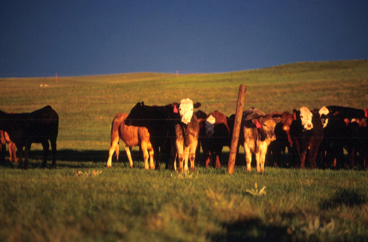 Herd of cattle gathered near fence as researcher's truck approaches.