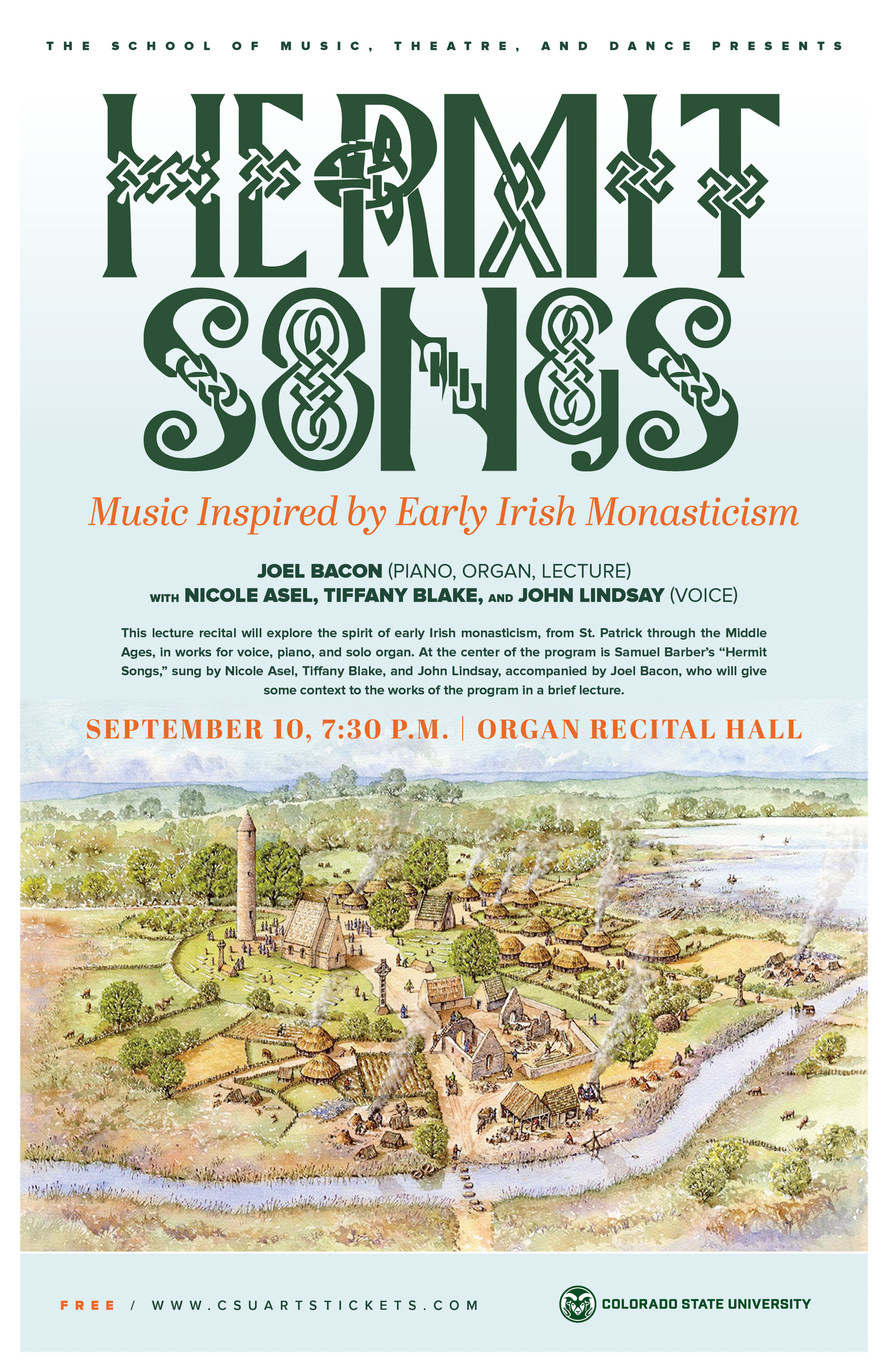 Hermit songs: music inspired by Early Irish Monasticism: Joel Bacon (piano, organ, lecture): with Nicole Asel, Tiffany Blake, and John Lindsay (voice)