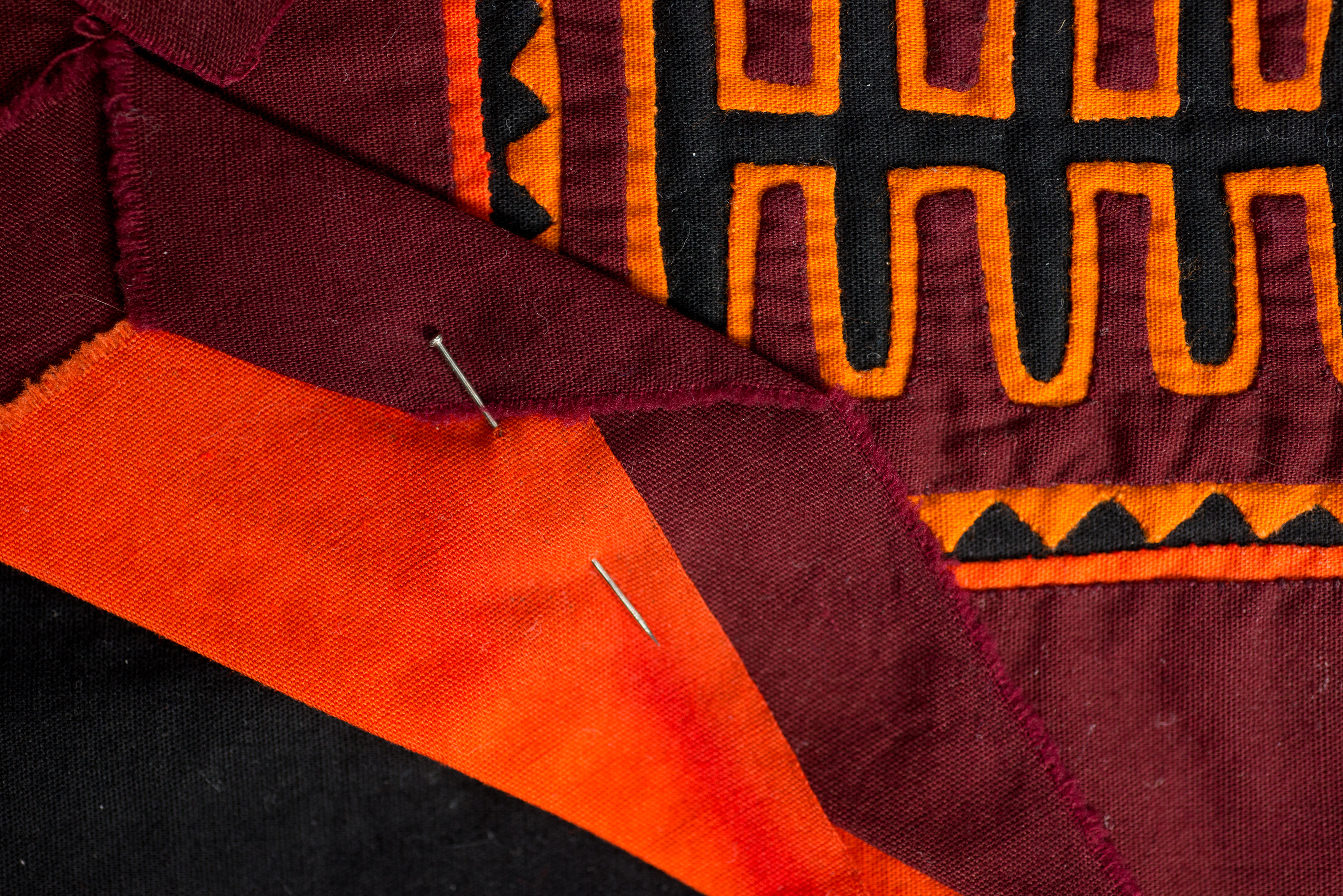 | dc.description | Cotton; 3 layers (maroon, yellow-orange, orange); reverse appliqué. | |