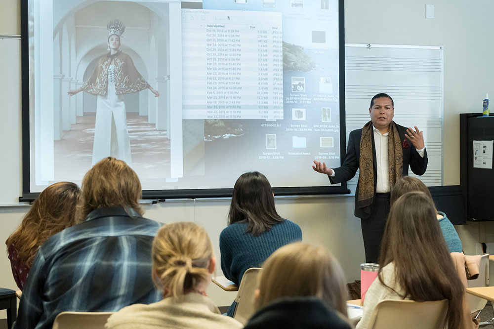 Photograph of designer Orlando Dugi speaking about his design inspiration to a class in 2019. Dugi is standing next to a projector screen with students seated in the foreground.
