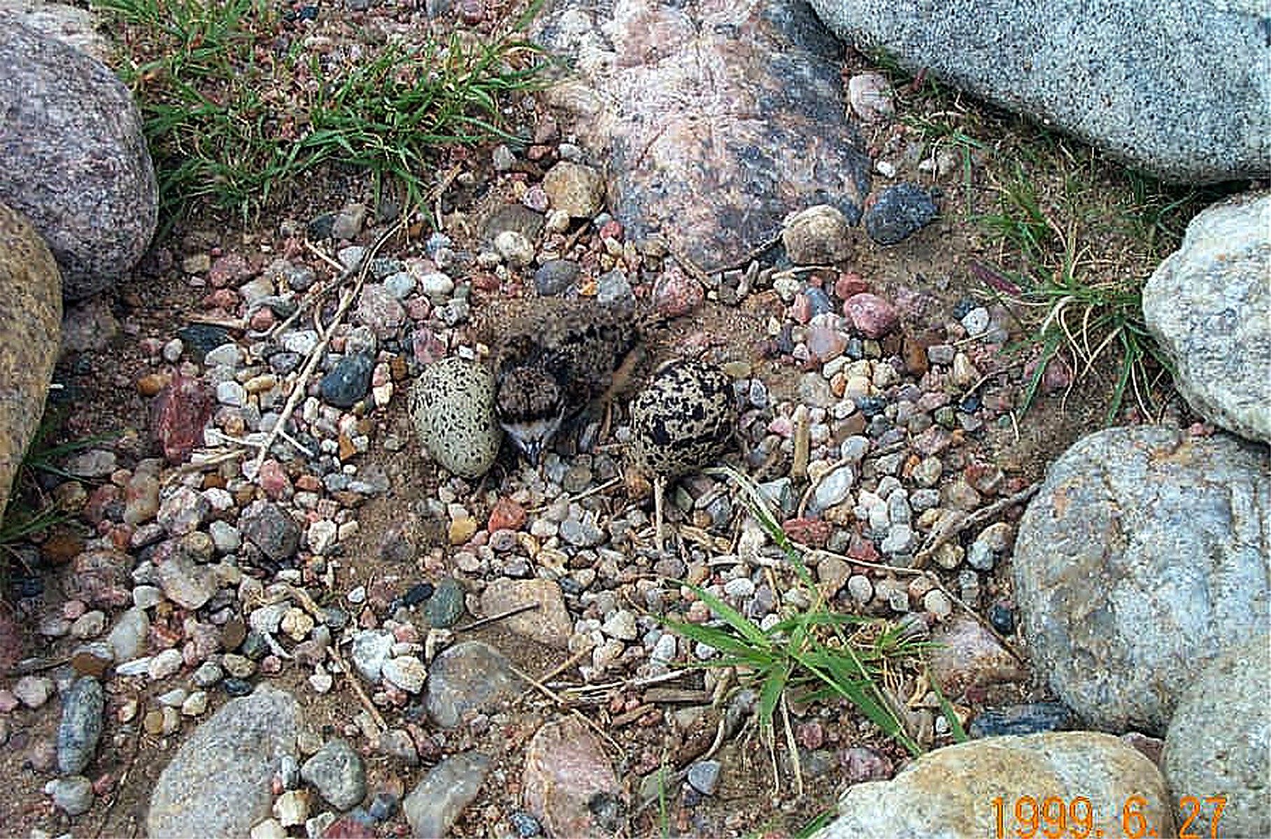 Killdeer chick with two eggs in rocky nest on SGS.