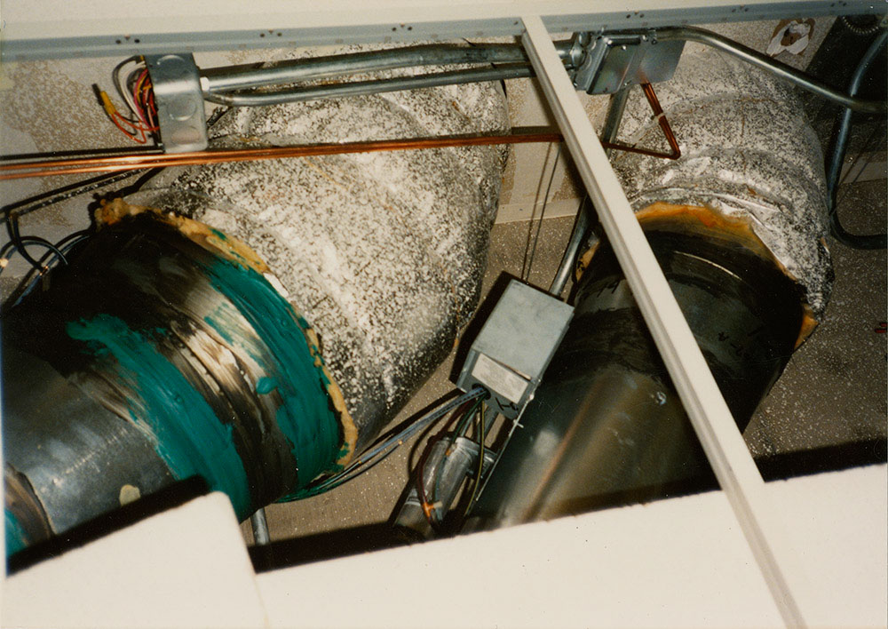 Photograph of 1990 renovations of the collection storage room on the third floor of the Gifford Building. Closeup of pipe ducts running into a wall and electrical wiring.