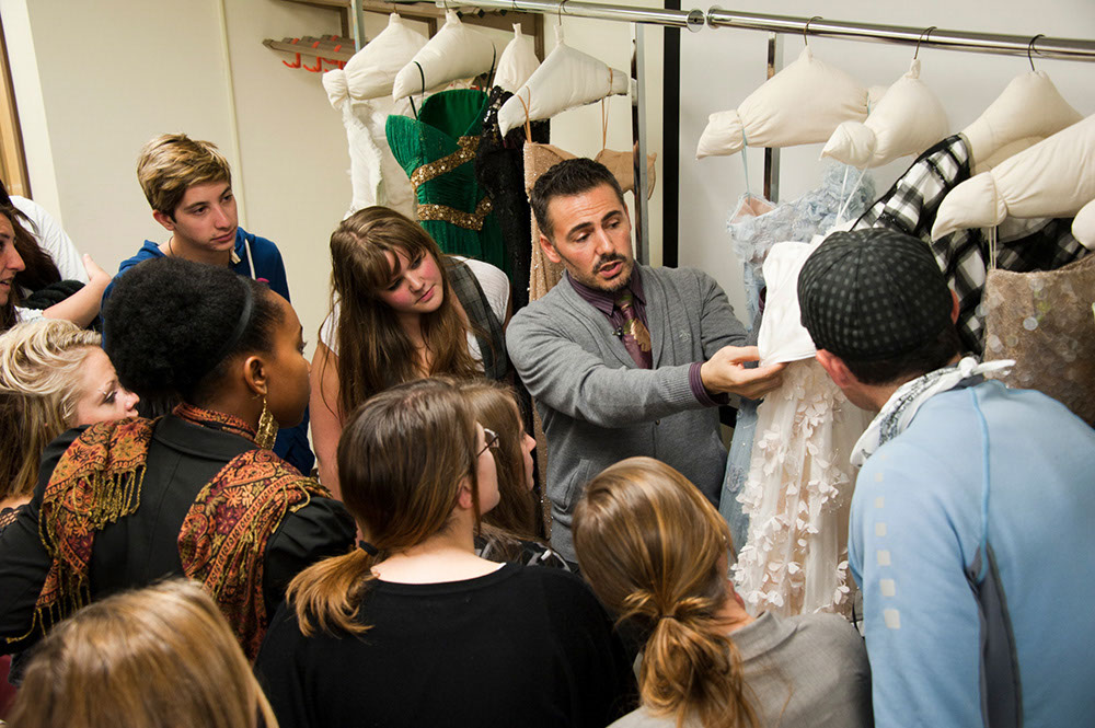 Photograph of designer Ali Rahimi discussing his designs with students in 2010. Rahimi is examining a garment on a clothing rack while students are gathered around him.