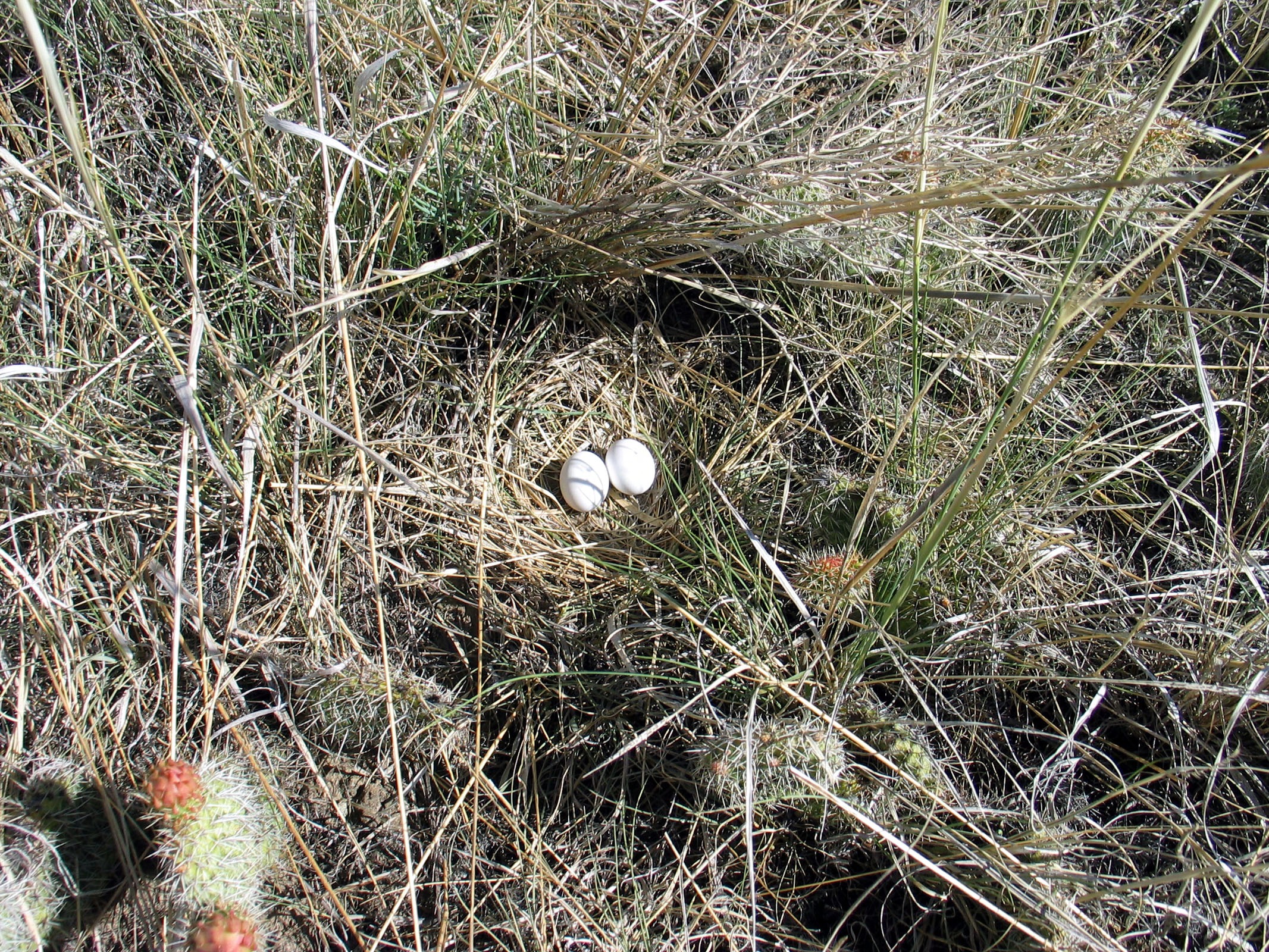 Morning dove nest, with two eggs, on SGS near prickly pear and in grass.