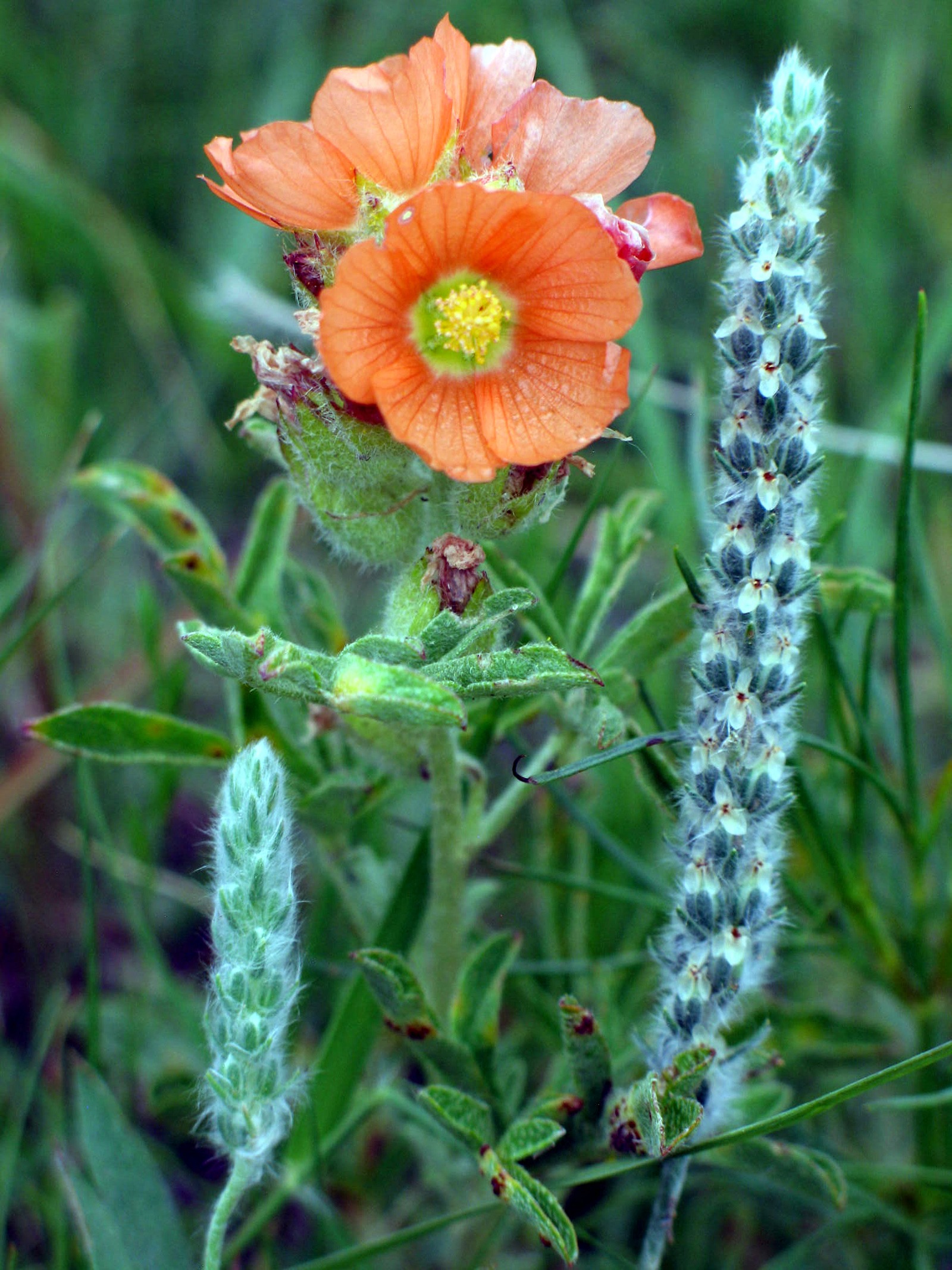 Orange SPCO, Sphaeralcea coccina, flowers next to (wooly) plantain in flower on the SGS.