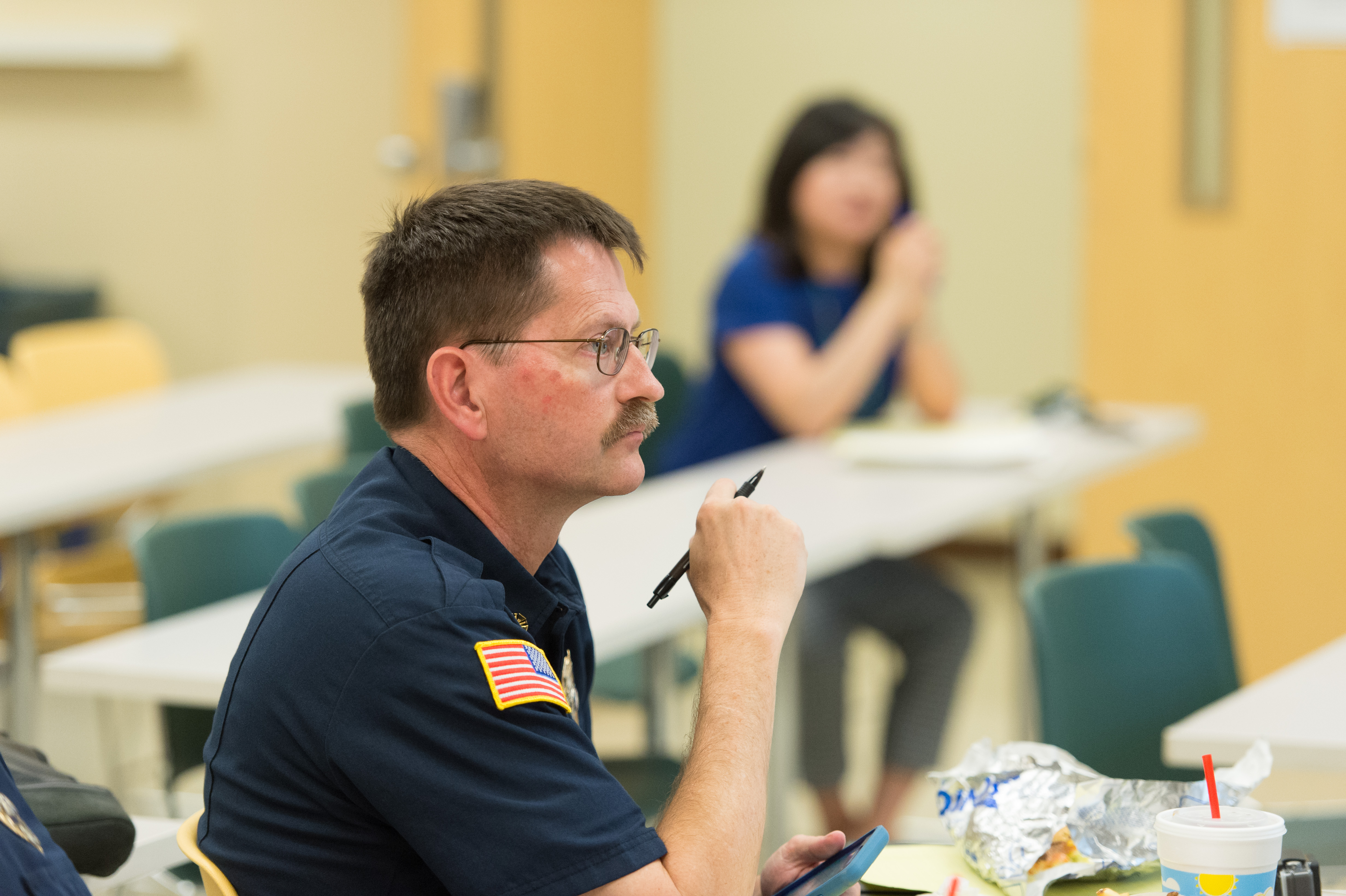 Fire Chief judging student projects (prototype firefighter uniforms)