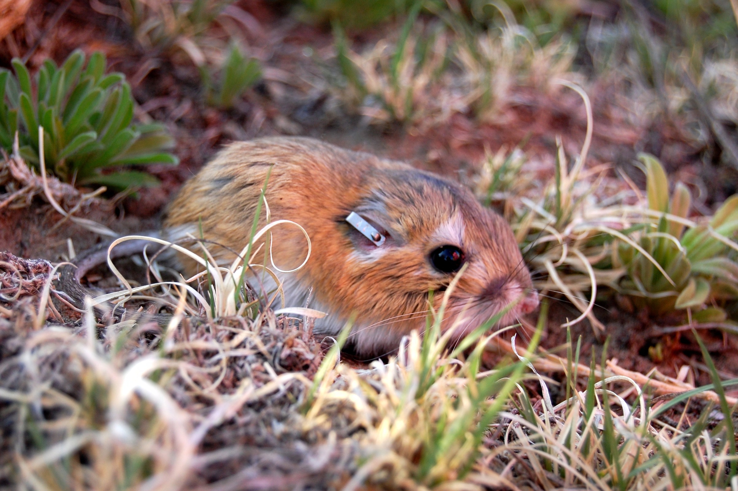 Closeup of tagged small mammal on the SGS, side view.