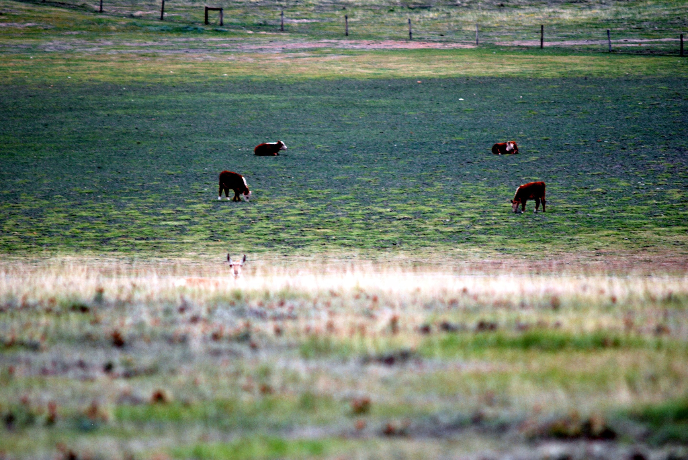 Cattle grazing on playa with pronghorn head and eyes visible through grass on crest of hill in foreground.