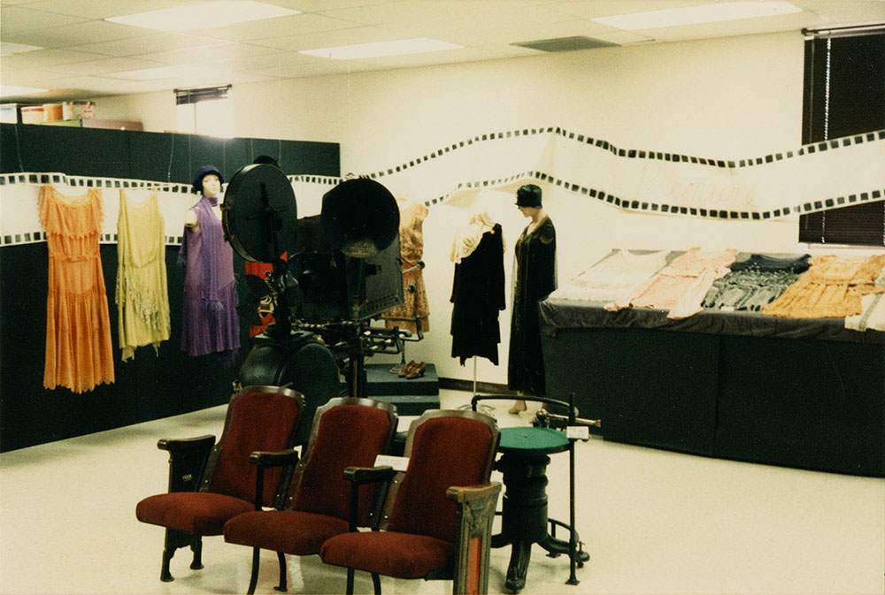 Photograph of "Picture the Twenties" exhibit installation held at the Gustafson Gallery in Fall 1986. In the foreground, there is a movie projector with theater seating. In the background, there are several dresses on display.