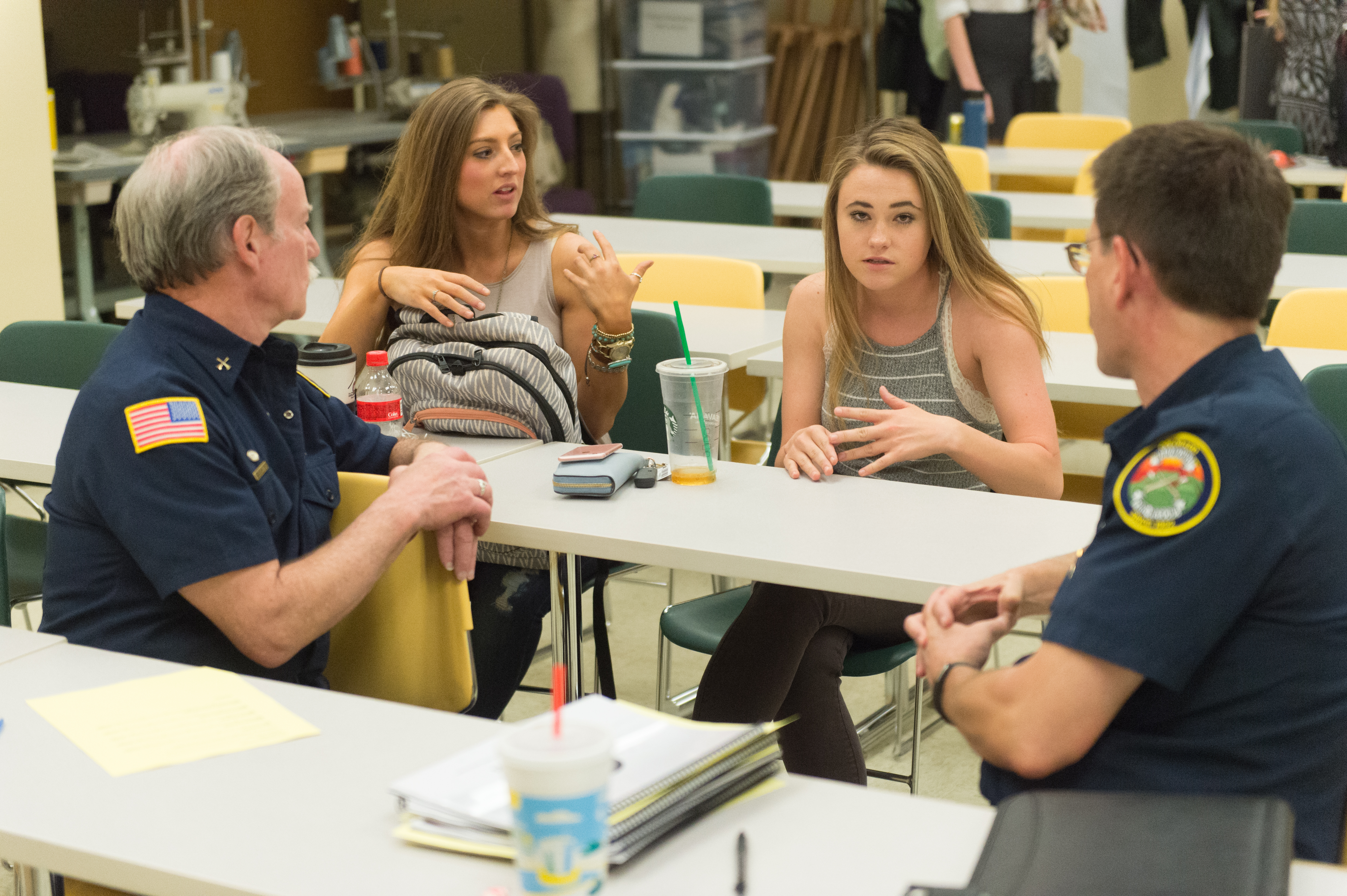 Firefighters talking with Team Marvel students