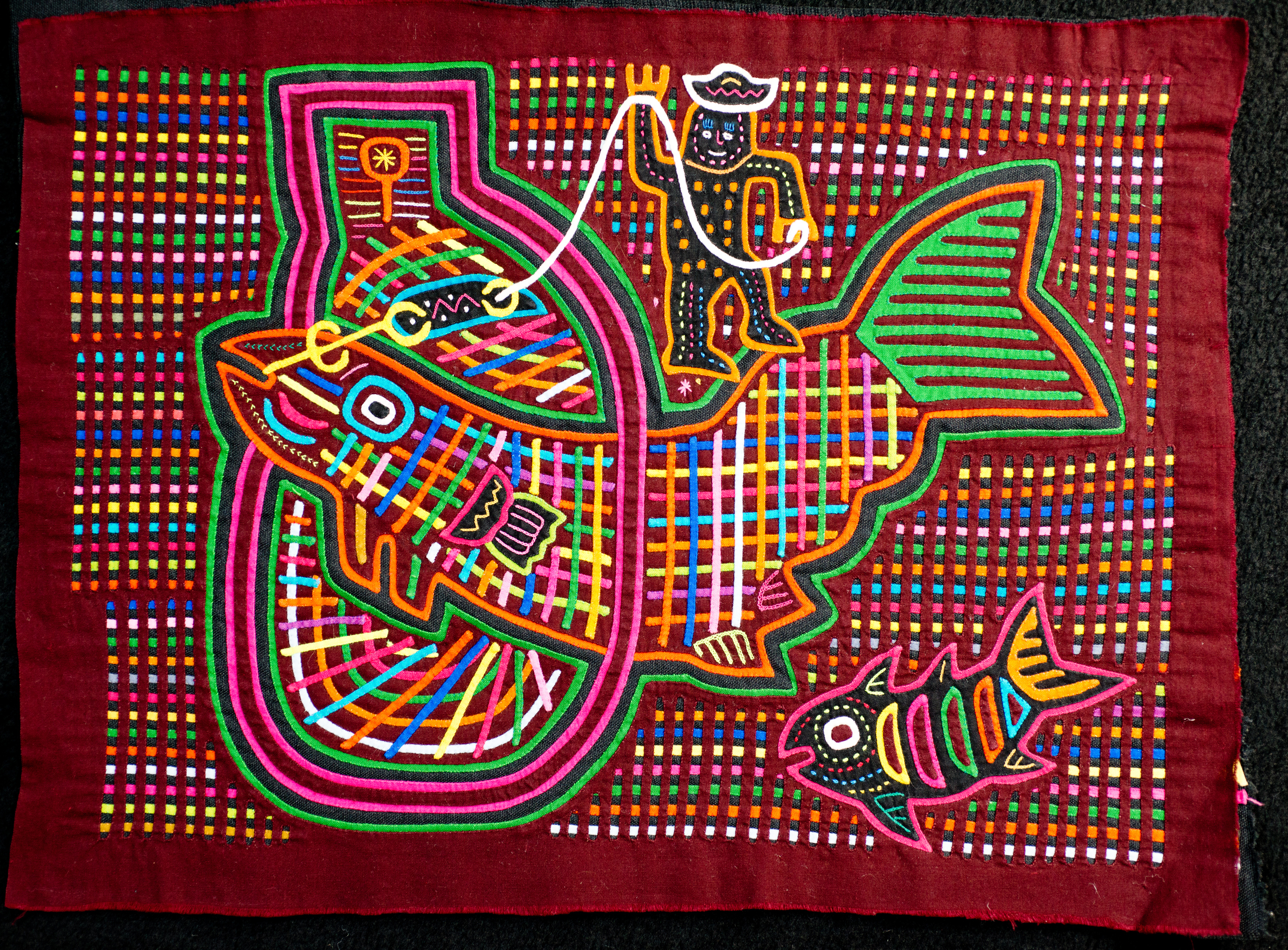 Here, a Kuna fisher nets a fish. Striped background technique was popular in the 1970s. Each stripe is a separately hemmed piece of cloth.