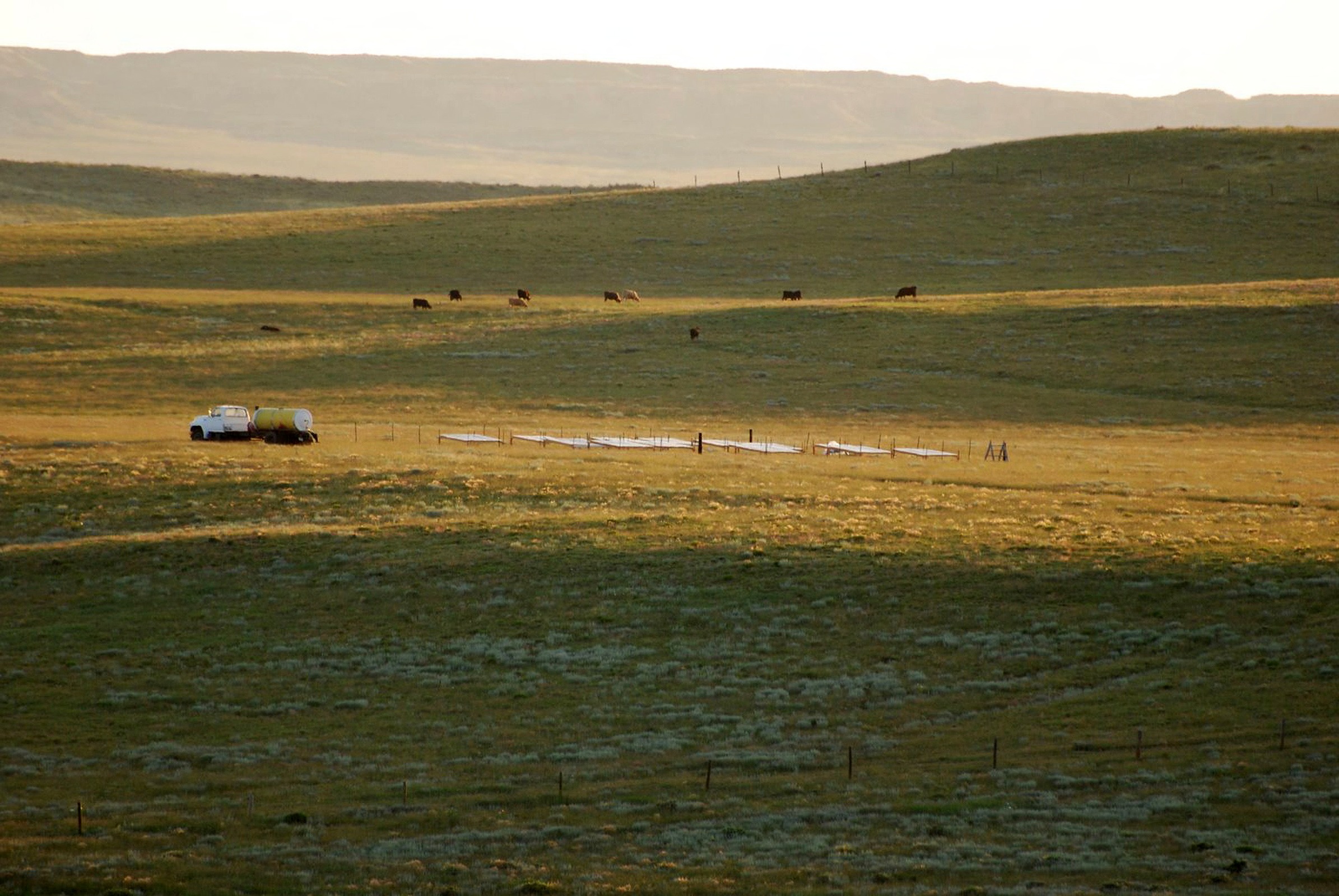 Low sun angle view of 2009 pulse experiment site on SGS, with shelters and watering tank, cows in distance.