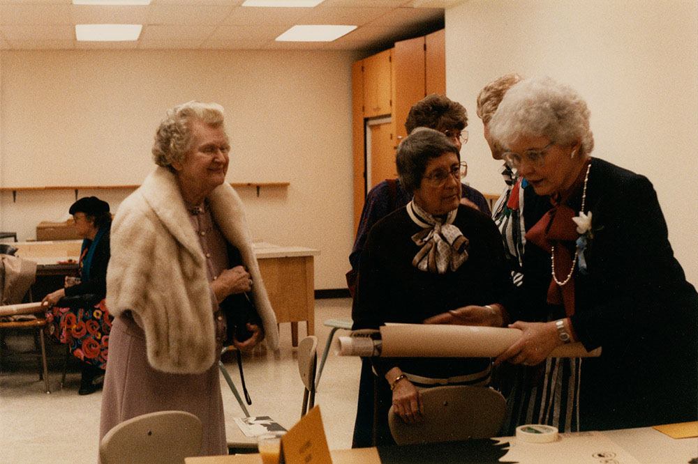 Photograph of three women, identified as left to right as Stella Morris Payne (former CSU registrar), Margaret Hazaleus (Assistant Dean of College), and Van Linck at the Gustafson Gallery dedication ceremony on March 11, 1987.