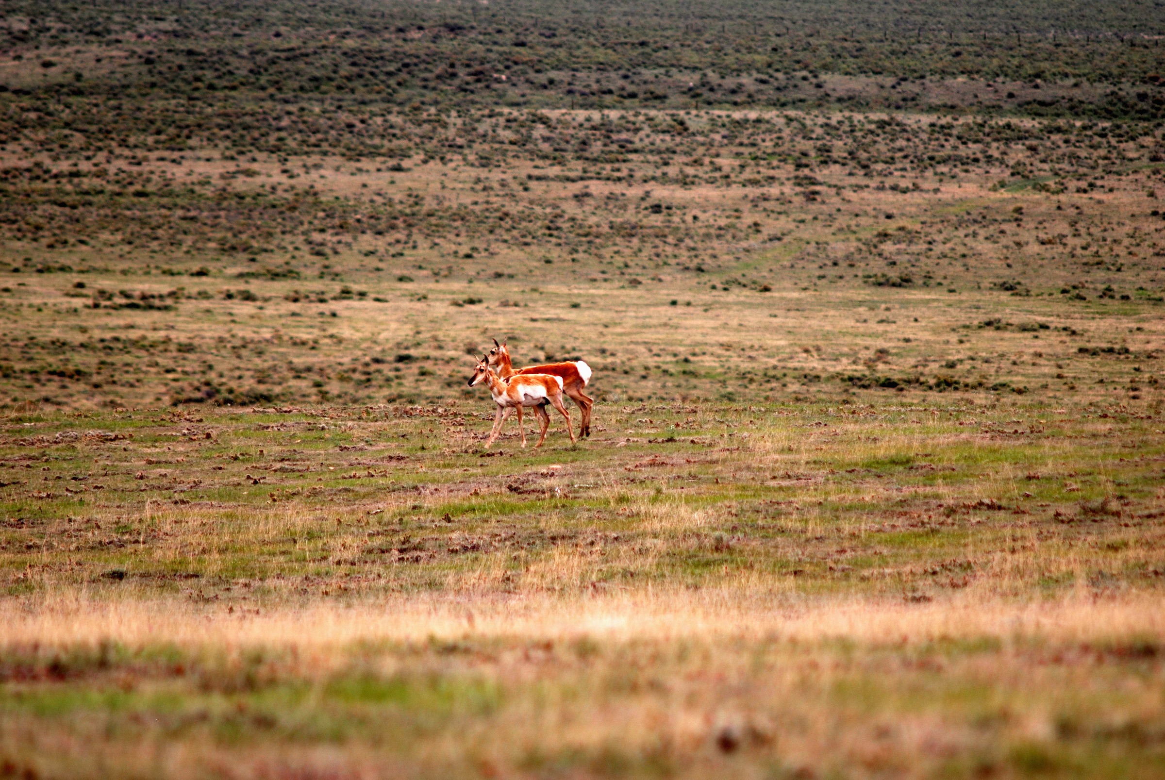 Two antelope, possibly mother and this year's offspring, walking on SGS, side-by-side.