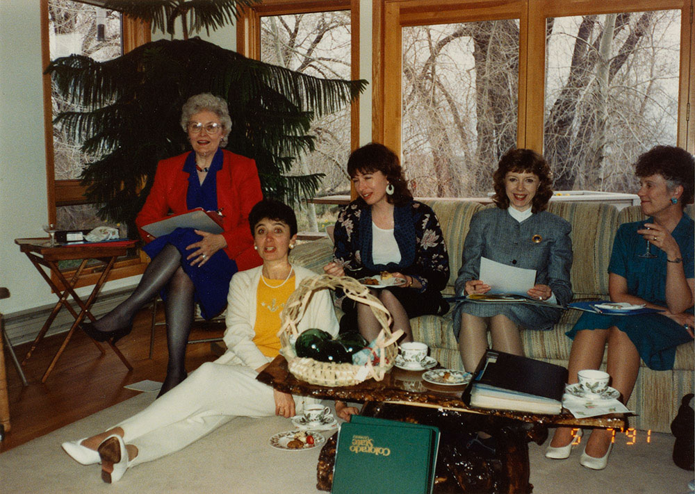 Photograph of several women at the Spring 1991 Friends of the Gustafson Gallery meeting. One woman is sitting on a chair, one woman is sitting on the floor, and three women are sitting on a couch. Two women are identified as Antigone Kotsiopulos and LaVon Blaesi.