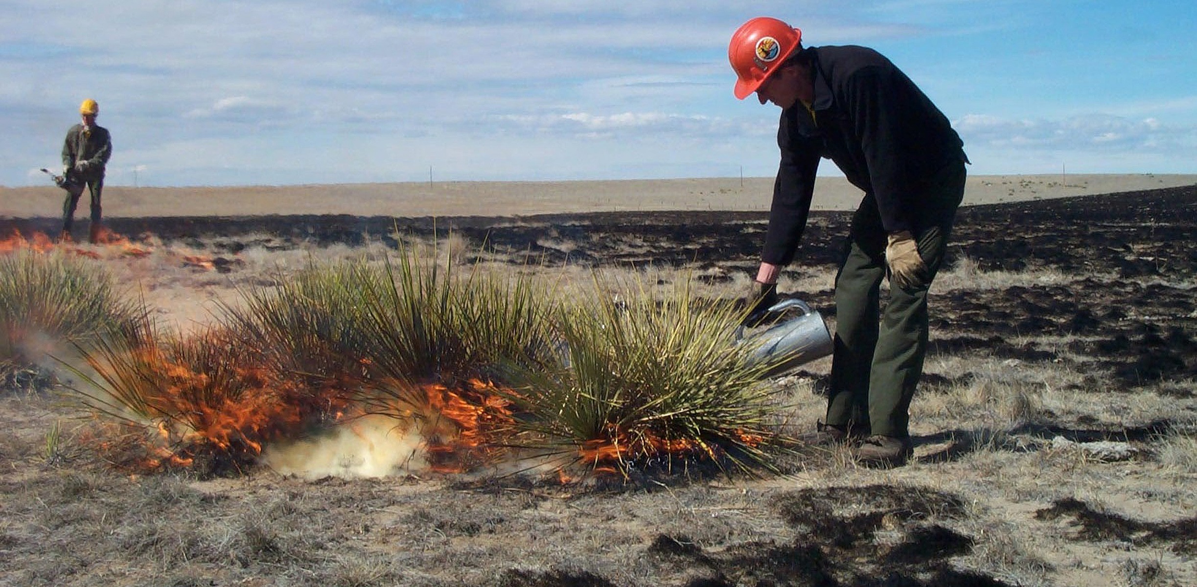 Controlled burn on SGS, with crew, flames, blackened grass, burning yucca.