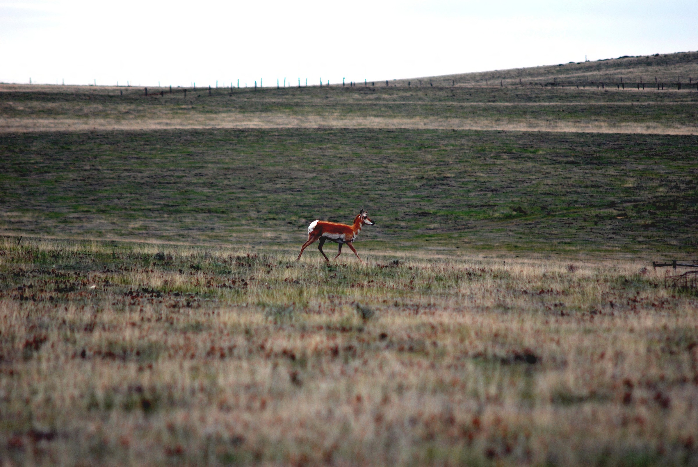 Solo pronghorn beginning to run across SGS, no close by fences in background.
