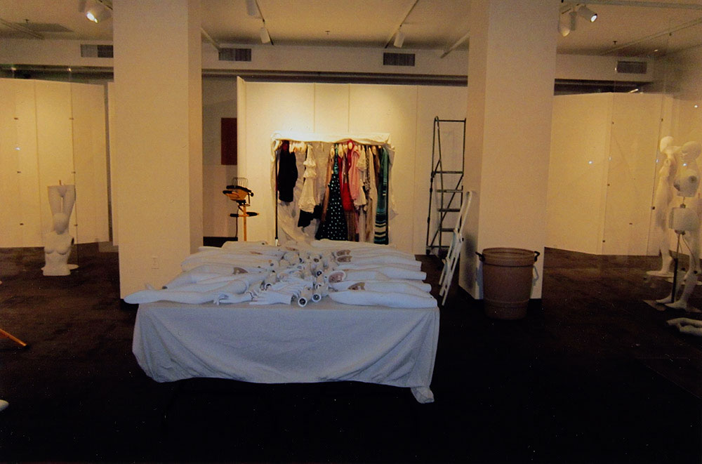 Photograph of "ABCS of the Avenir" gallery installation for fall 2012. Includes table with mannequin parts lined up, and mannequin parts along the walls. In the background, is a rack full of clothes.