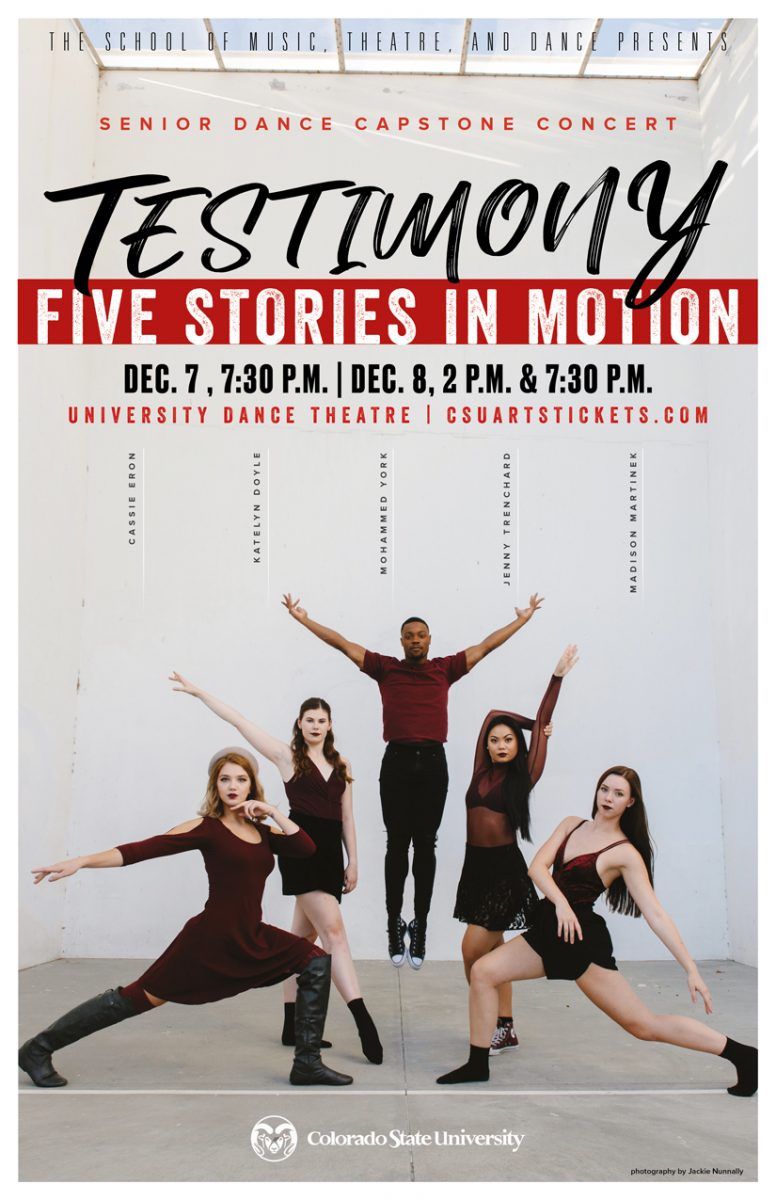 Testimony: five stories in motion: senior dance capstone concert: Cassie Eron, Katelyn Doyle, Mohammed York, Jenny Trenchard, Madison Martinek