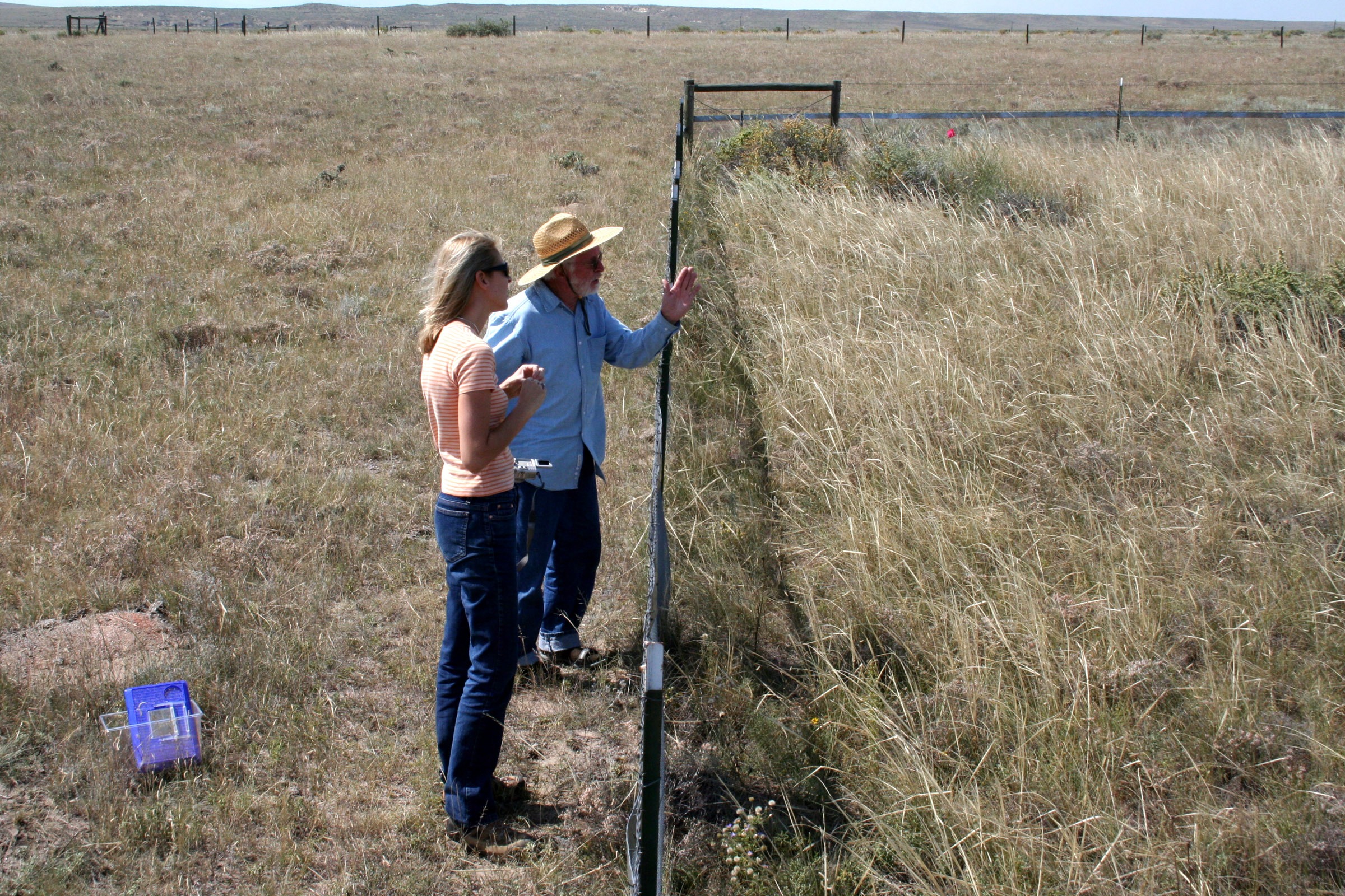 Two researchers discussing vegetation in small mammal exclosure fence on SGS.