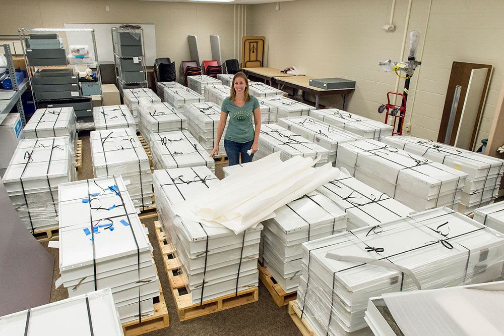 Photograph of Collections Manager Megan Osborne standing among stacks of collection drawers waiting to be unpacked into the newly expanded Avenir Museum of Design and Merchandising in 2015.