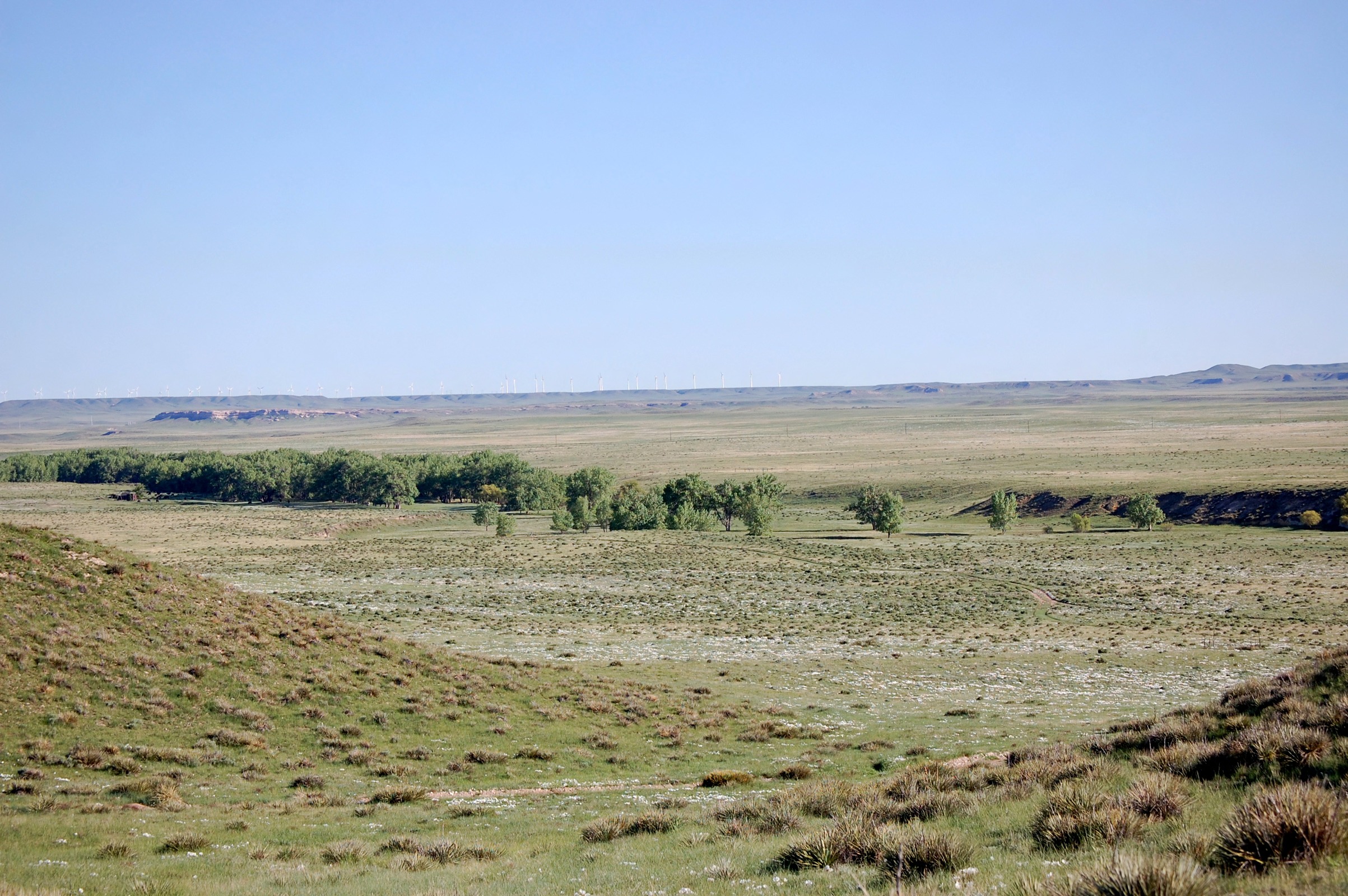 Cottonwoods along upper Owl Creek on SGS, Slayton site, windmills in distance, white flowers in bloom.