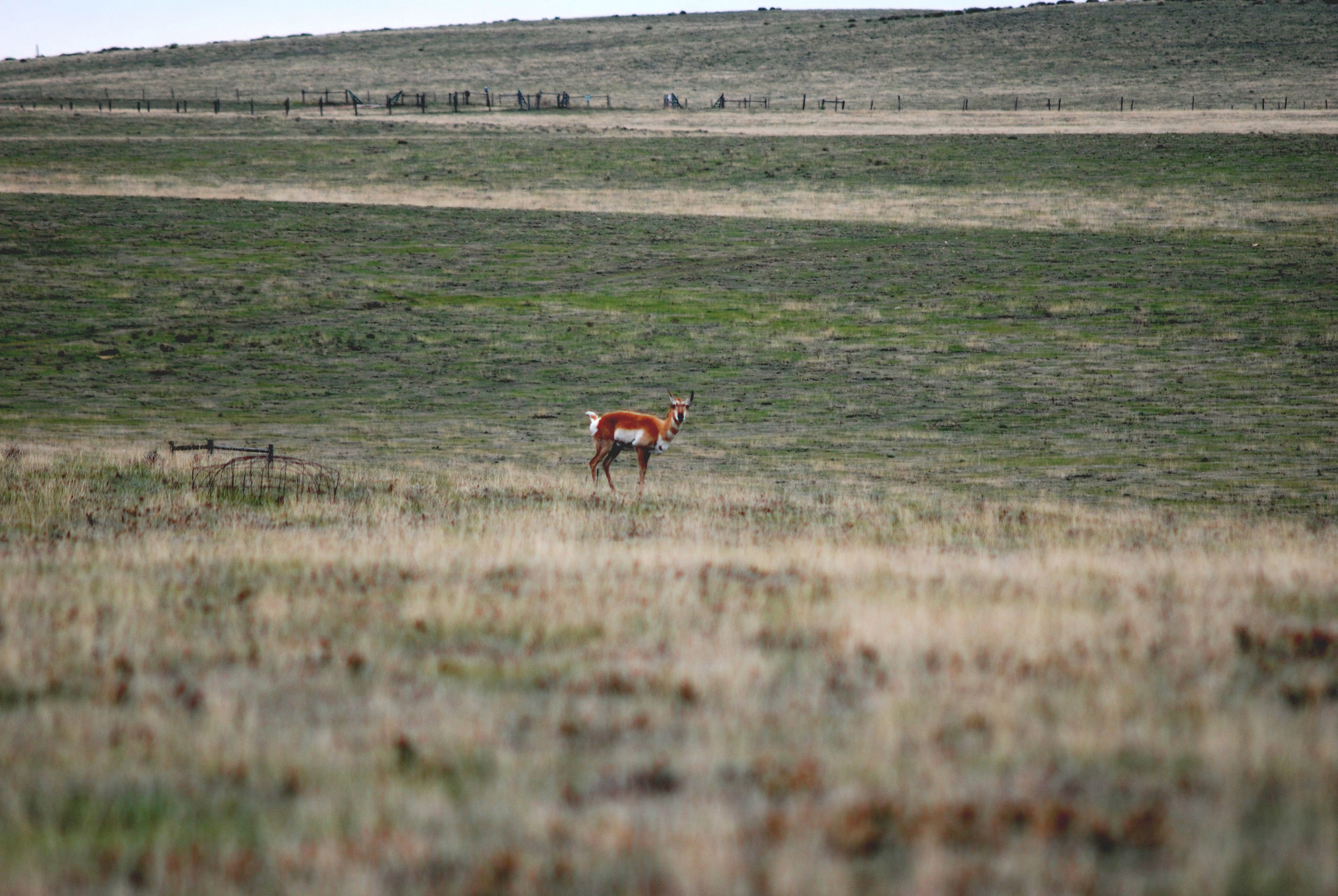 Solo pronghorn dropping pellets on SGS, head turned toward people.