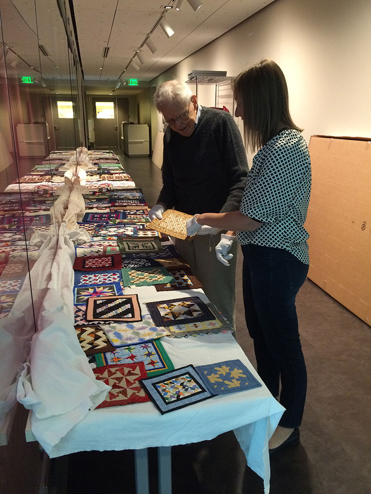 Photograph of faculty member emeritus Jack Curfman and Assistant Curator and Collections Manager Megan Osborne planning the installation of the “Tiny Bits and Pieces” exhibit in 2015. Curfman and Osborne are examining a textile piece next to a table with several textiles pieces laid on top.