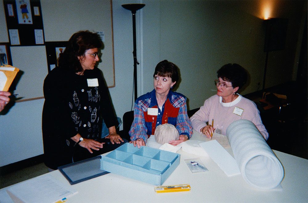 Photograph of Jeanne Brako demonstrating to Jennifer Kutzik and an unidentified woman how to store hats and other small items during an April 2000 workshop. Brako is standing next to a table where the two women are sitting. There are storage supplies on the table.