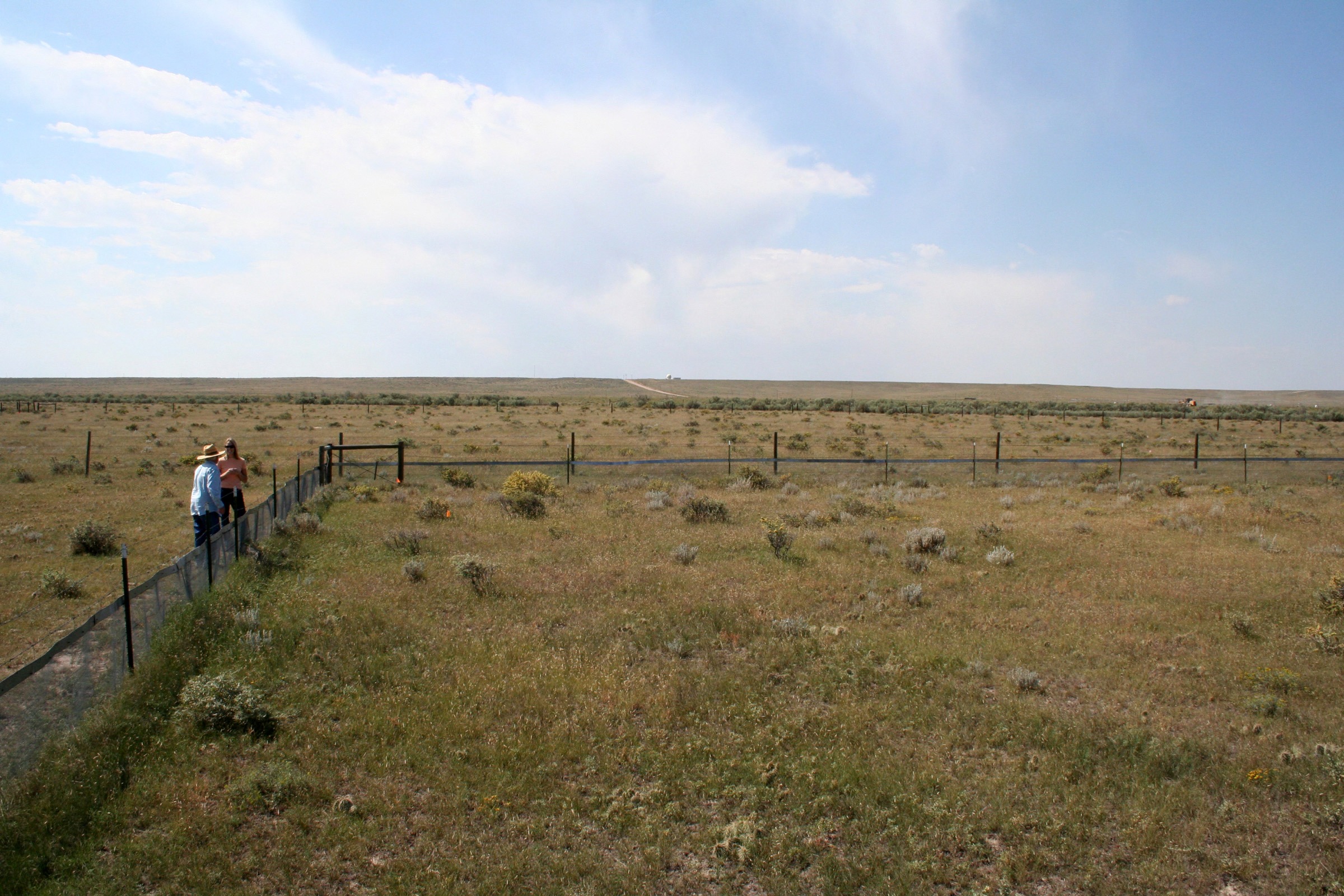 Broad view of pastures in and outside small mammal exclosure fence on SGS, with researchers at fence.