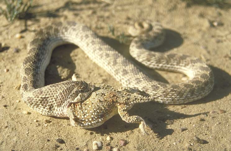 Hognose snake consuming short-horned lizard on shortgrass steppe.