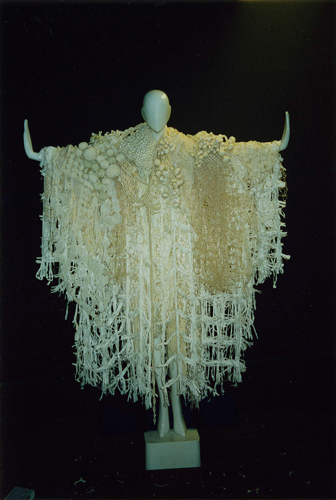 Photograph of garment made by Betts' scholar, Dr. Robert Hillestad. Garment is displayed on mannequin with arms spread out to showcase drapery and texture.