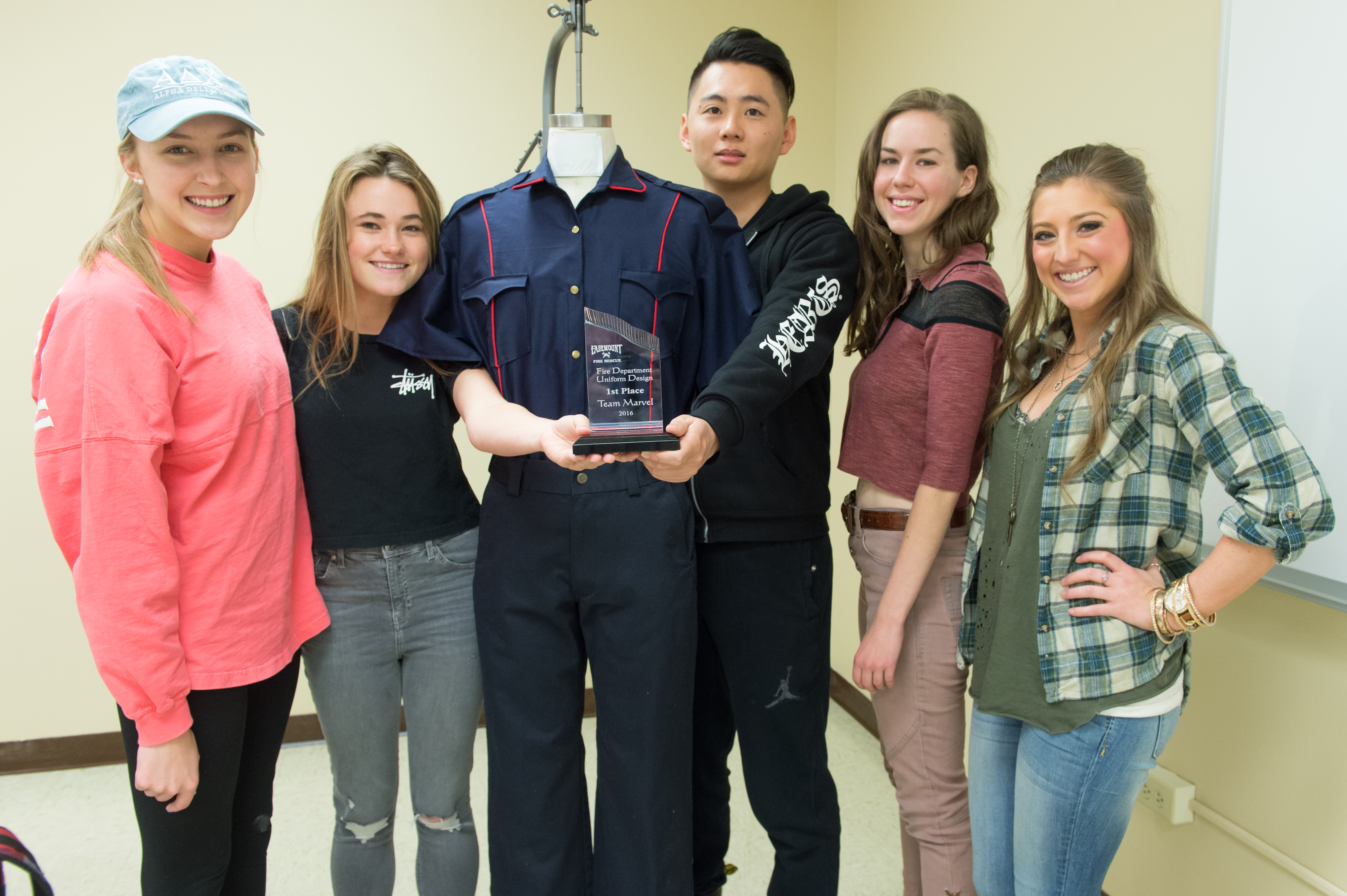 Team Marvel with 1st place trophy (first place) and prototype firefighter uniform