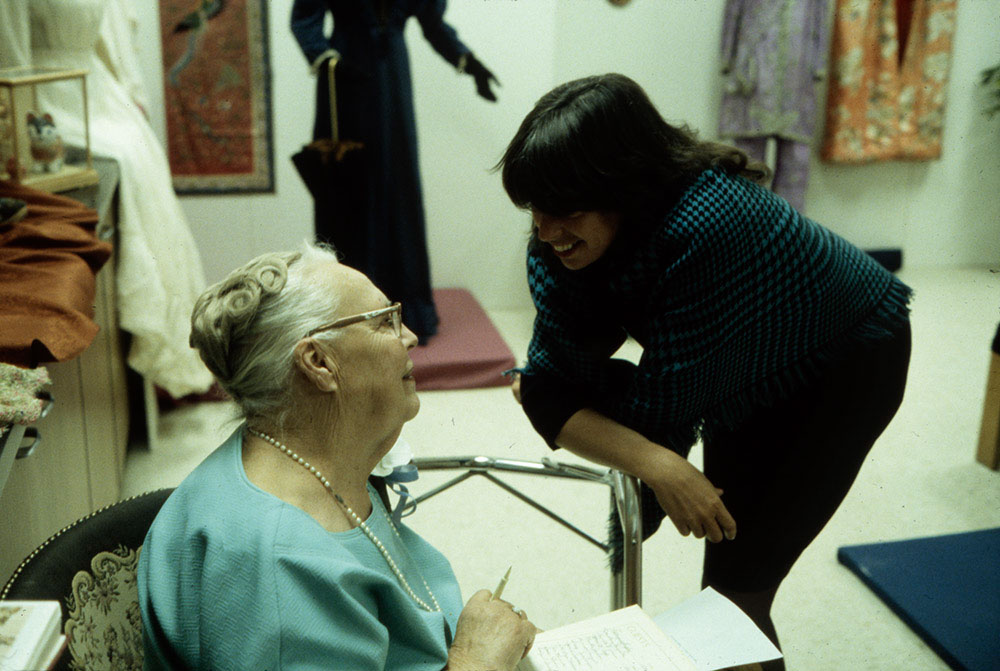 | dc.description.abstract | Photograph of Evelyn Gustafson and Janet Hethorn at the Old Beginnings exhibit in the Gustafson Gallery. Gustafson is sitting down, and Hethorn is leaning down towards her. | |