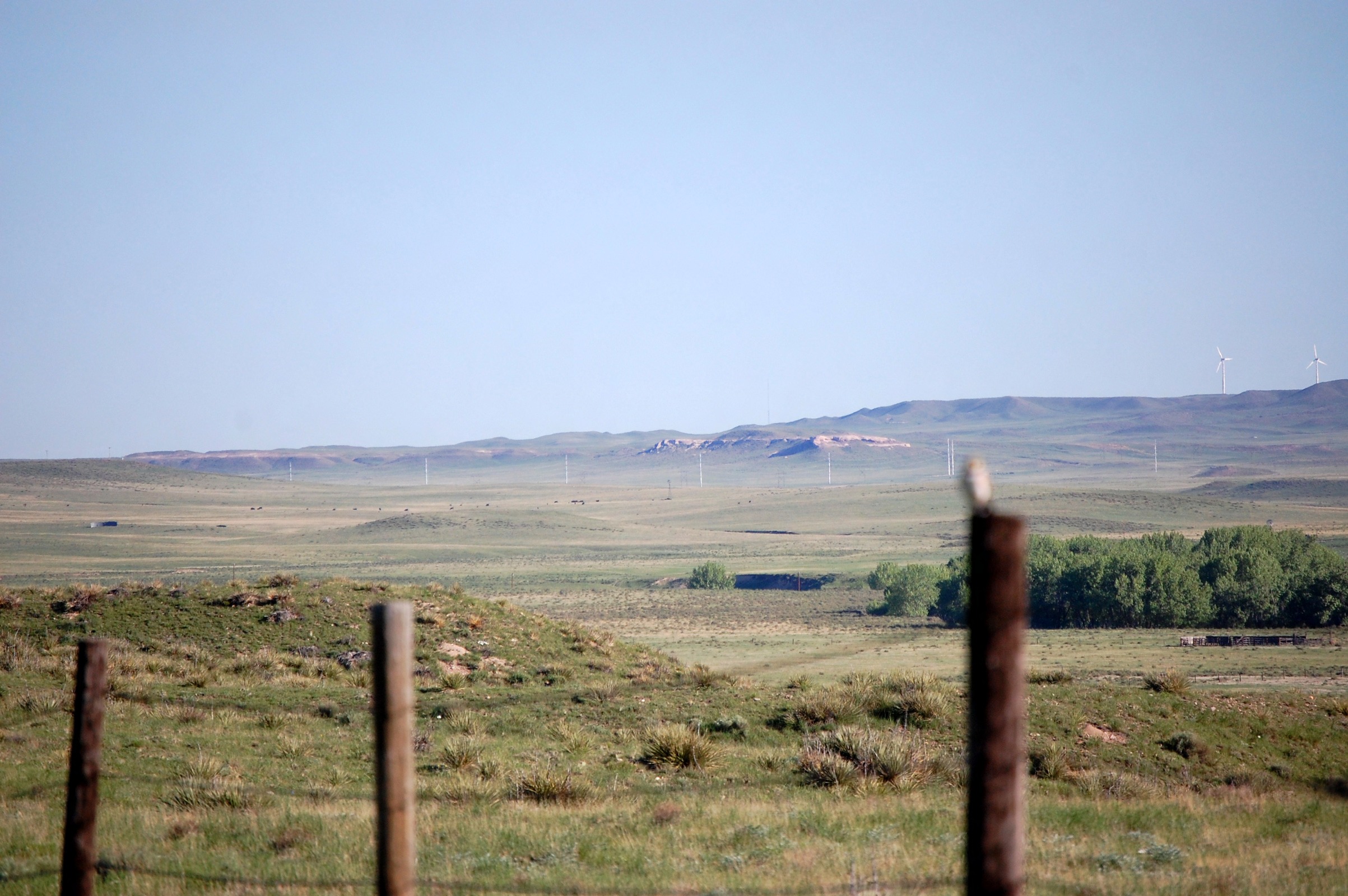 Background of rolling prairie with ridge and power lines, and OOF horned lark on fence (see next two pictures).