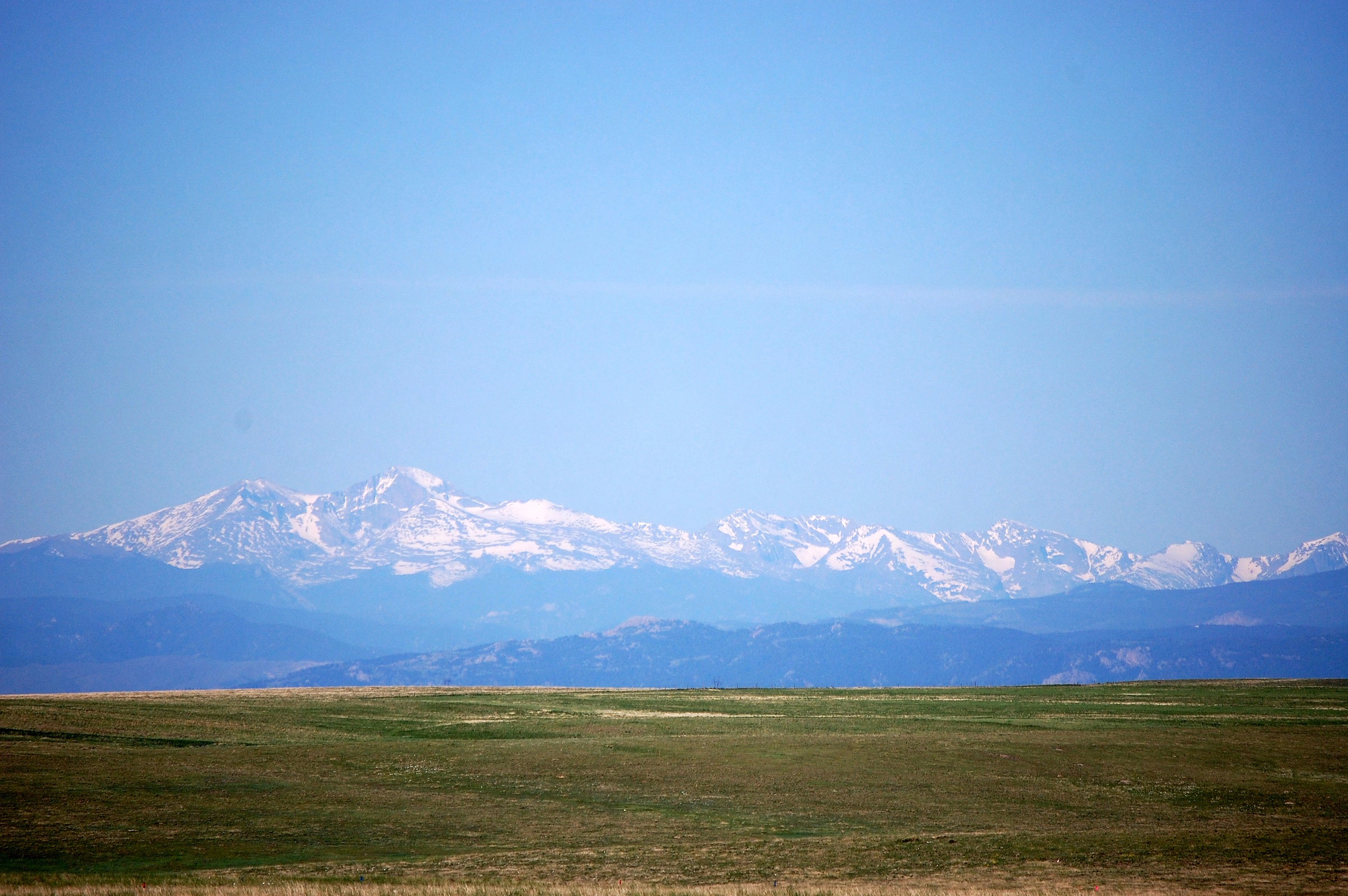 Telephoto view of spring vegetation on SGS with snow-capped Rocky Mountains in distance.