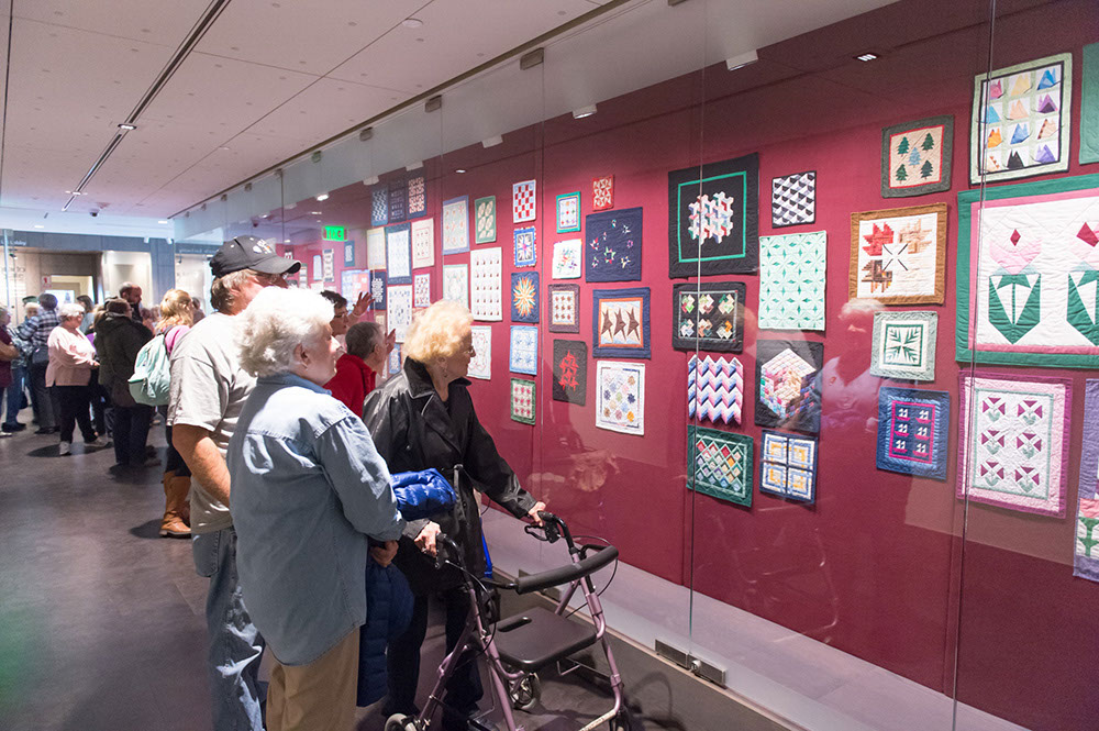 Photograph of visitors viewing the inaugural 2016 exhibit in The Lucile E. Hawks Gallery, “Tiny Bits and Pieces,” featuring miniature quilts made by Hawks.