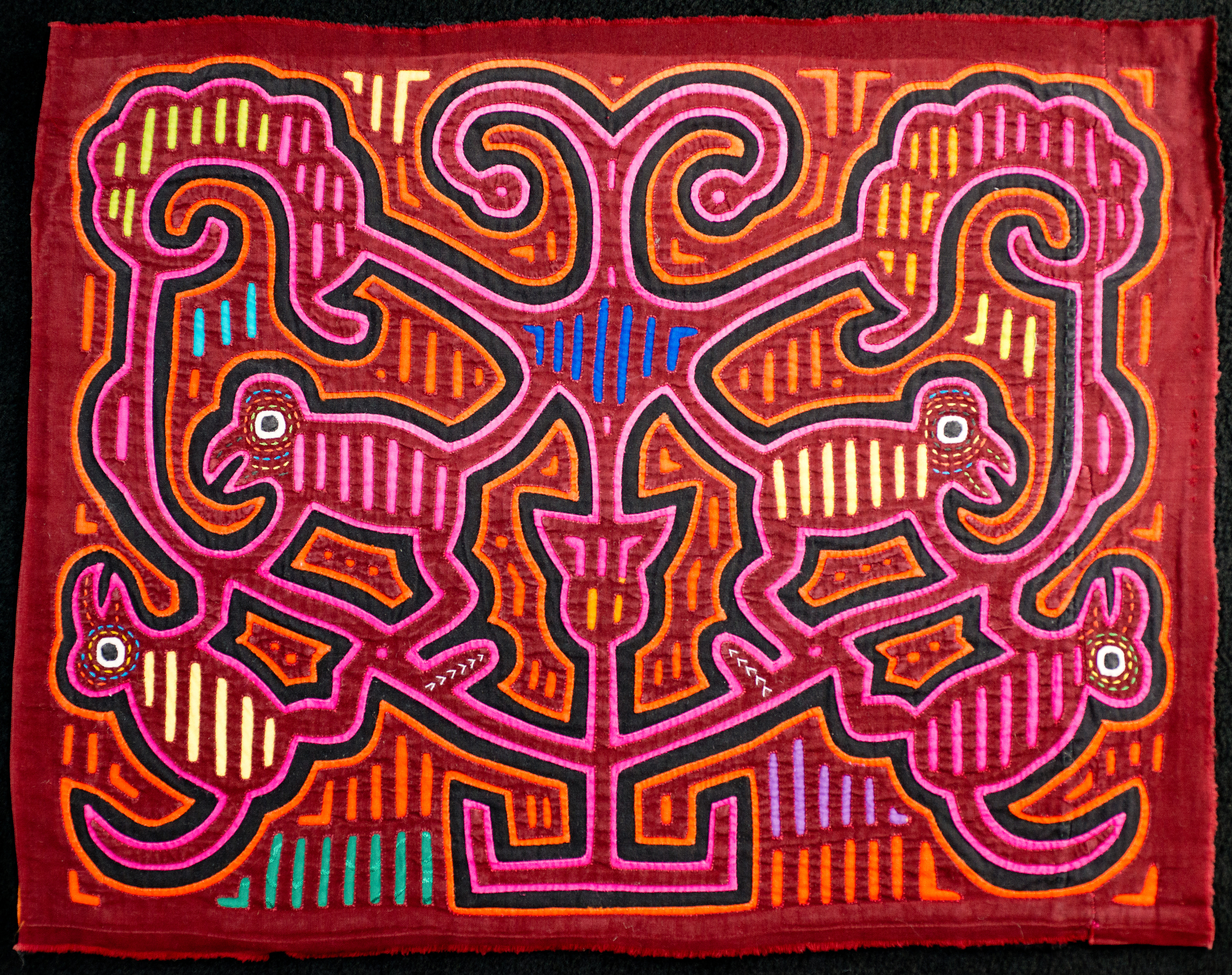Artisans worldwide have crafted trees of life designs containing various plants and animals. These Kuna trees of life are filled with monkeys. This mola is made in colors commonly used in molas that are worn by Kuna women.