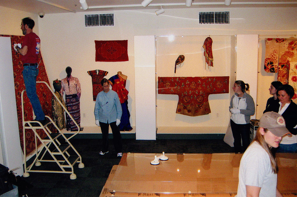 Photograph of Window to the World spring 2009 exhibit installation. People identified as guest exhibit designer and preparatory, Jack Townes, Curator, Linda Carlson, and Collections Manager, Megan Osborne, are working on the installation.