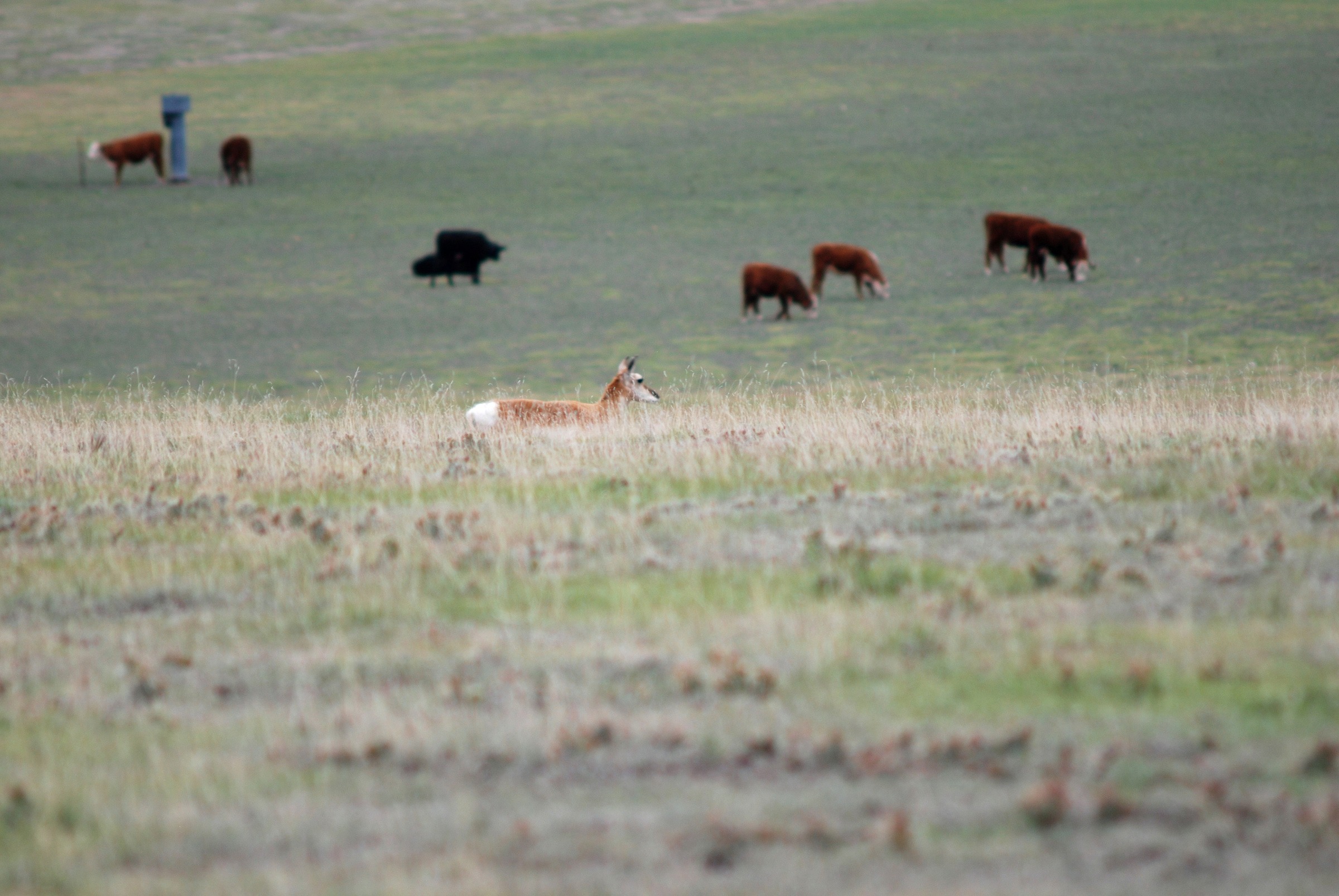 Cattle grazing on playa with pronghorn walking along hill in foreground, just over the crest.