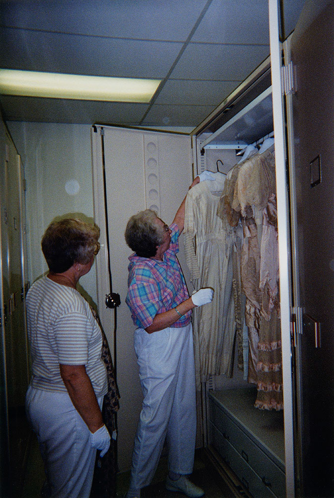 Photograph of two volunteers identified as Anne Kylen and Jan Else placing historic clothing into new storage units during a May 2000 storage upgrade project, funded by an Institute of Museum and Library Services grant.