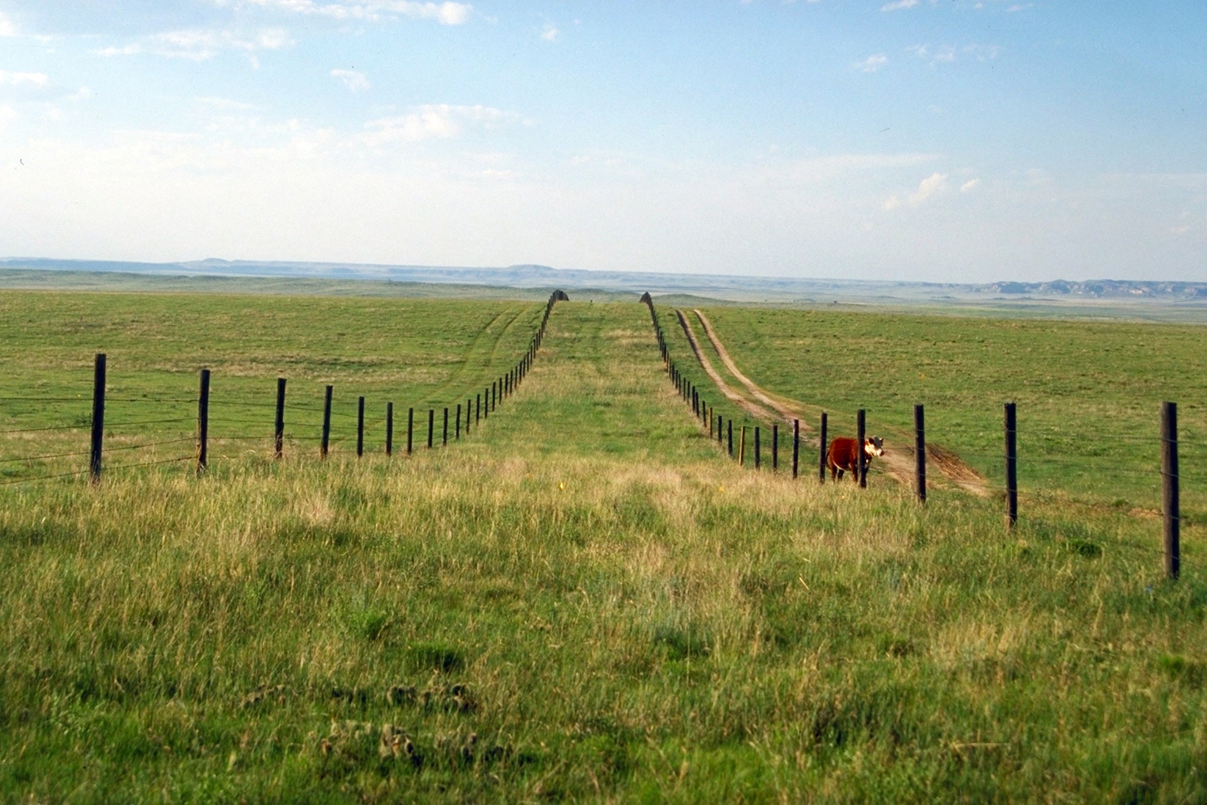View down the middle of the grazing strip with one cow along right-side fence line.