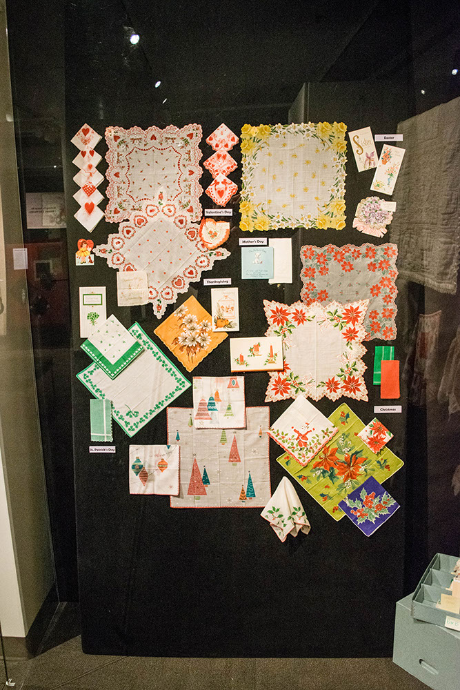 Photograph of a selection of handkerchiefs in the exhibit installation, “Nothing to Sneeze at: One Woman – 1,107 Handkerchiefs,” held in the Avenir Gallery in the University Center for the Arts in the spring of 2018 Several handkerchiefs are displayed on a wall.