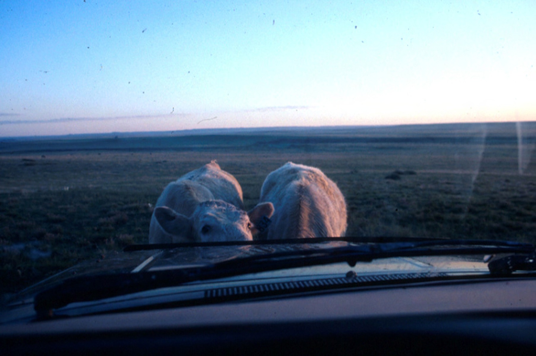 Two white cows investigating the front of researcher's truck, original title had 'AT' as the symbol '@'.